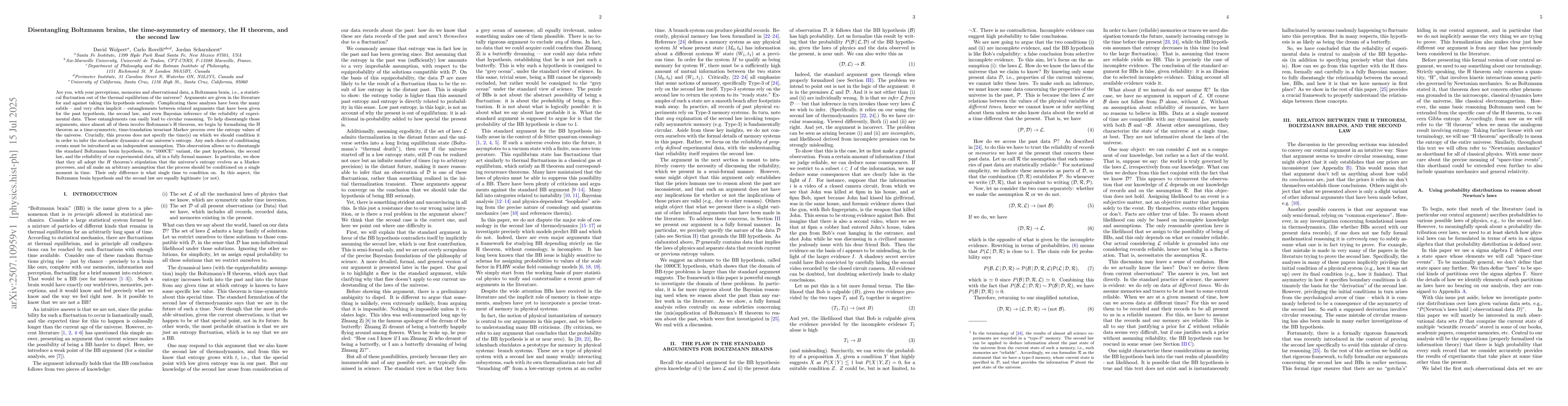 Are you, with your perceptions, memories and observational data, a Boltzmann brain, i.e., a statistical fluctuation out of the thermal equilibrium of the universe? Arguments are given in the literature for and against taking this hypothesis seriously. Complicating these analyses have been the many subtle - and very often implicit - entanglements between related arguments that have been given for the past hypothesis, the second law, and even Bayesian inference of the reliability of experimental data. These entanglements can easily lead to circular reasoning. To help disentangle those arguments, since almost all of them involve Boltzmann's H theorem, we begin by formalizing the H theorem as a time-symmetric, time-translation invariant Markov process over the entropy values of the universe. Crucially, this process does not specify the time(s) on which we should condition it in order to infer the stochastic dynamics of our universe's entropy. Any such choice of conditioning events must be introduced as an independent assumption. This observation allows us to disentangle the standard Boltzmann brain hypothesis, its "1000CE" variant, the past hypothesis, the second law, and the reliability of our experimental data, all in a fully formal manner. In particular, we show that they all adopt the H theorem's stipulation that the universe's entropy evolves as a Markov processes, and all make an arbitrary assumption that the process should be conditioned on a single moment in time. Their only difference is what single time to condition on. In this aspect, the Boltzmann brain hypothesis and the second law are equally legitimate (or not).