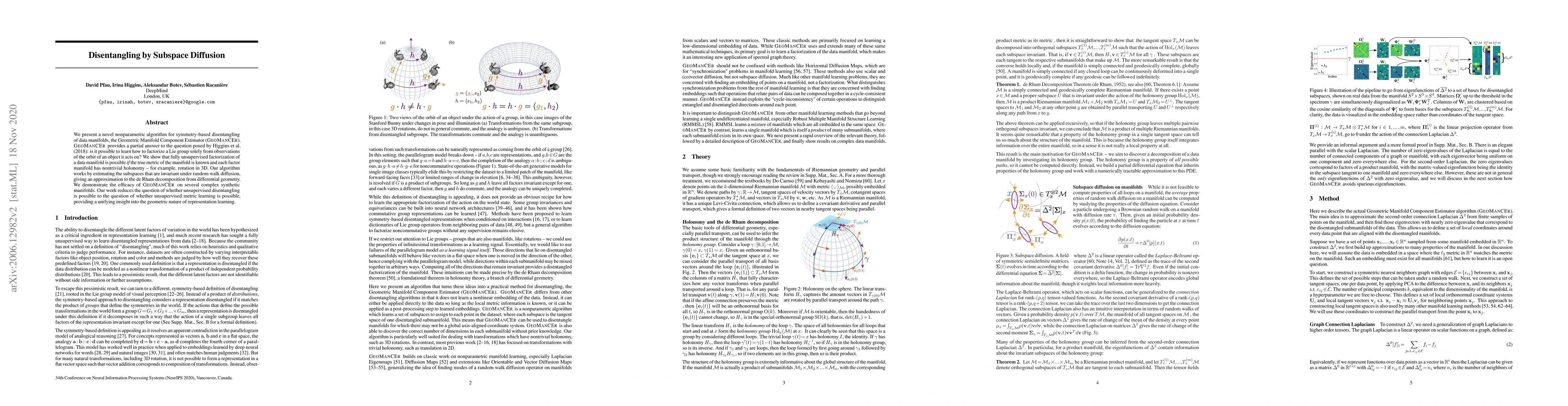 We present a novel nonparametric algorithm for symmetry-based disentangling of data manifolds, the Geometric Manifold Component Estimator (GEOMANCER). GEOMANCER provides a partial answer to the question posed by Higgins et al. (2018): is it possible to learn how to factorize a Lie group solely from observations of the orbit of an object it acts on? We show that fully unsupervised factorization of a data manifold is possible if the true metric of the manifold is known and each factor manifold has nontrivial holonomy -- for example, rotation in 3D. Our algorithm works by estimating the subspaces that are invariant under random walk diffusion, giving an approximation to the de Rham decomposition from differential geometry. We demonstrate the efficacy of GEOMANCER on several complex synthetic manifolds. Our work reduces the question of whether unsupervised disentangling is possible to the question of whether unsupervised metric learning is possible, providing a unifying insight into the geometric nature of representation learning.