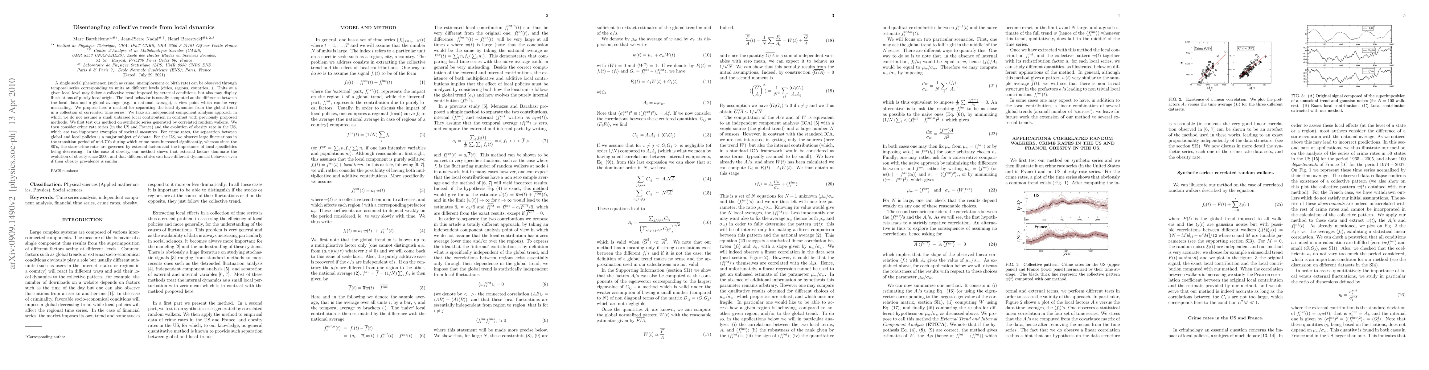 A single social phenomenon (such as crime, unemployment or birth rate) can be observed through temporal series corresponding to units at different levels (cities, regions, countries...). Units at a given local level may follow a collective trend imposed by external conditions, but also may display fluctuations of purely local origin. The local behavior is usually computed as the difference between the local data and a global average (e.g. a national average), a view point which can be very misleading. We propose here a method for separating the local dynamics from the global trend in a collection of correlated time series. We take an independent component analysis approach in which we do not assume a small unbiased local contribution in contrast with previously proposed methods. We first test our method on synthetic series generated by correlated random walkers. We then consider crime rate series (in the US and France) and the evolution of obesity rate in the US, which are two important examples of societal measures. For crime rates, the separation between global and local policies is a major subject of debate. For the US, we observe large fluctuations in the transition period of mid-70's during which crime rates increased significantly, whereas since the 80's, the state crime rates are governed by external factors and the importance of local specificities being decreasing. In the case of obesity, our method shows that external factors dominate the evolution of obesity since 2000, and that different states can have different dynamical behavior even if their obesity prevalence is similar.