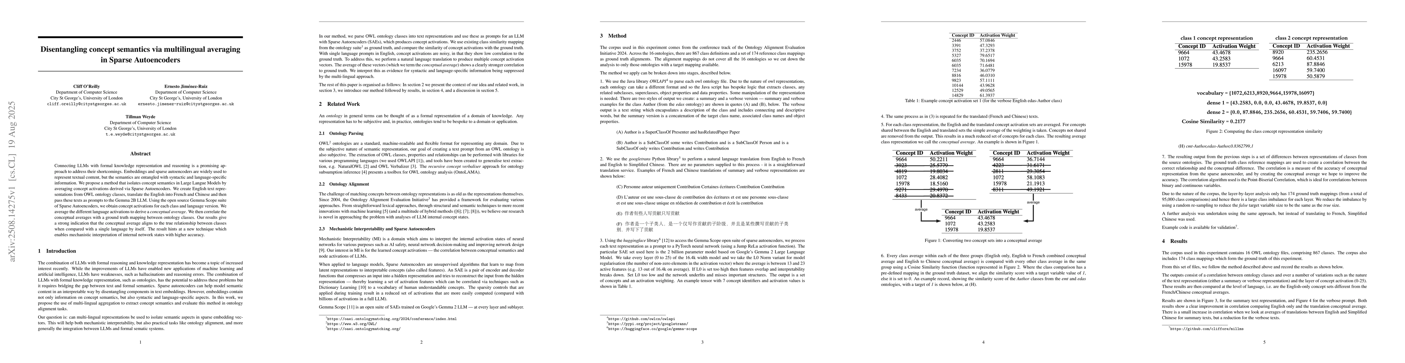 Connecting LLMs with formal knowledge representation and reasoning is a promising approach to address their shortcomings. Embeddings and sparse autoencoders are widely used to represent textual content, but the semantics are entangled with syntactic and language-specific information. We propose a method that isolates concept semantics in Large Langue Models by averaging concept activations derived via Sparse Autoencoders. We create English text representations from OWL ontology classes, translate the English into French and Chinese and then pass these texts as prompts to the Gemma 2B LLM. Using the open source Gemma Scope suite of Sparse Autoencoders, we obtain concept activations for each class and language version. We average the different language activations to derive a conceptual average. We then correlate the conceptual averages with a ground truth mapping between ontology classes. Our results give a strong indication that the conceptual average aligns to the true relationship between classes when compared with a single language by itself. The result hints at a new technique which enables mechanistic interpretation of internal network states with higher accuracy.
