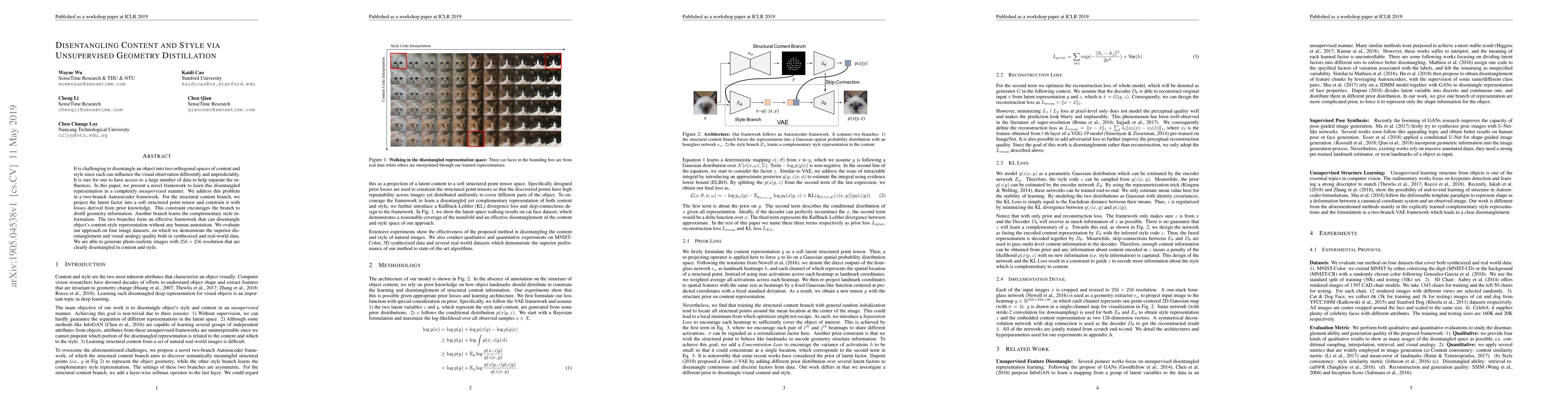 This paper introduces an unsupervised framework using a two-branch Autoencoder to disentangle content and style in images without human annotations. The structural content branch distills geometry information through soft structured point tensors, while the style branch captures complementary style information.