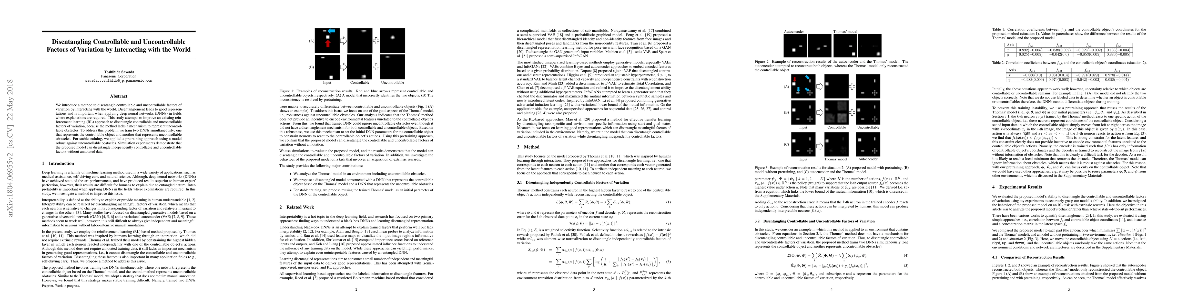We introduce a method to disentangle controllable and uncontrollable factors of variation by interacting with the world. Disentanglement leads to good representations and is important when applying deep neural networks (DNNs) in fields where explanations are required. This study attempts to improve an existing reinforcement learning (RL) approach to disentangle controllable and uncontrollable factors of variation, because the method lacks a mechanism to represent uncontrollable obstacles. To address this problem, we train two DNNs simultaneously: one that represents the controllable object and another that represents uncontrollable obstacles. For stable training, we applied a pretraining approach using a model robust against uncontrollable obstacles. Simulation experiments demonstrate that the proposed model can disentangle independently controllable and uncontrollable factors without annotated data.