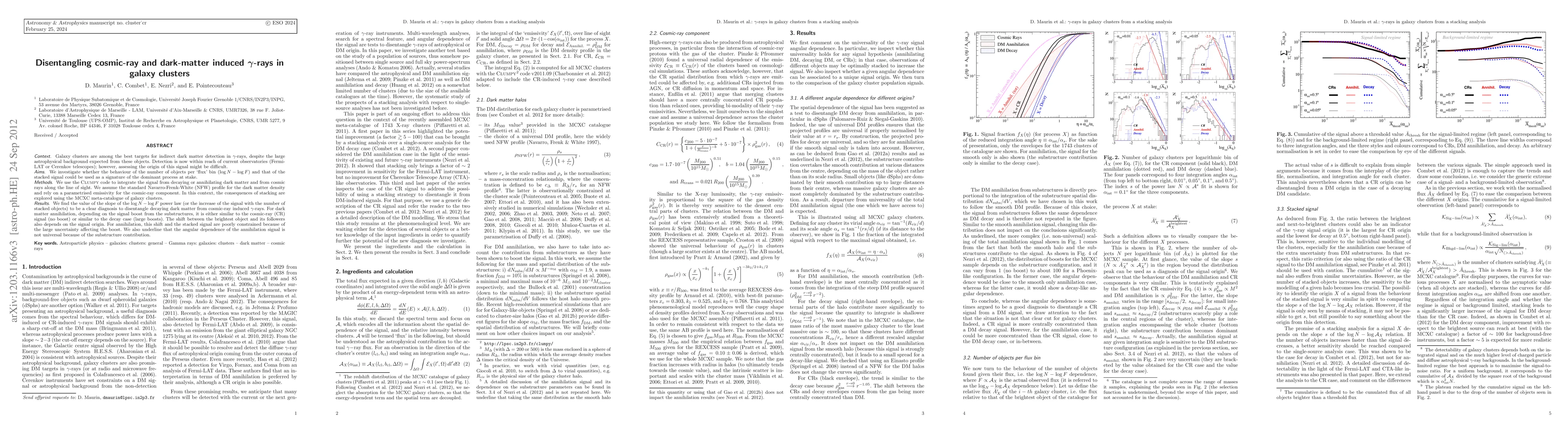Galaxy clusters are among the best targets for indirect dark matter detection in gamma-rays, despite the large astrophysical background expected from these objects. Detection is now within reach of current observatories (Fermi-LAT or Cerenkov telescopes); however, assessing the origin of this signal might be difficult. We investigate whether the behaviour of the number of objects per `flux' bin (logN-logF) and that of the stacked signal could be used as a signature of the dominant process at stake.We use the CLUMPY code to integrate the signal from decaying or annihilating dark matter and cosmic rays along the line of sight. We assume the standard NFW profile for the dark matter density and rely on a parametrised emissivity for the cosmic-ray component. In this context, the consequences of stacking are explored using the MCXC meta-catalogue of galaxy clusters. We find the value of the slope of the logN-logF power law (or the increase of the signal with the number of stacked objects) to be a clear diagnosis to disentangle decaying dark matter from cosmic-ray induced gamma-rays. For dark matter annihilation, depending on the signal boost from the substructures, it is either similar to the cosmic-ray signal (no boost) or similar to the decay case (large boosts). The shift between the brightest object and its followers also depends on the signal origin. For annihilation, this shift and the stacked signal are poorly constrained because of the large uncertainty affecting the boost. We also underline that the angular dependence of the annihilation signal is not universal because of the substructure contribution.
