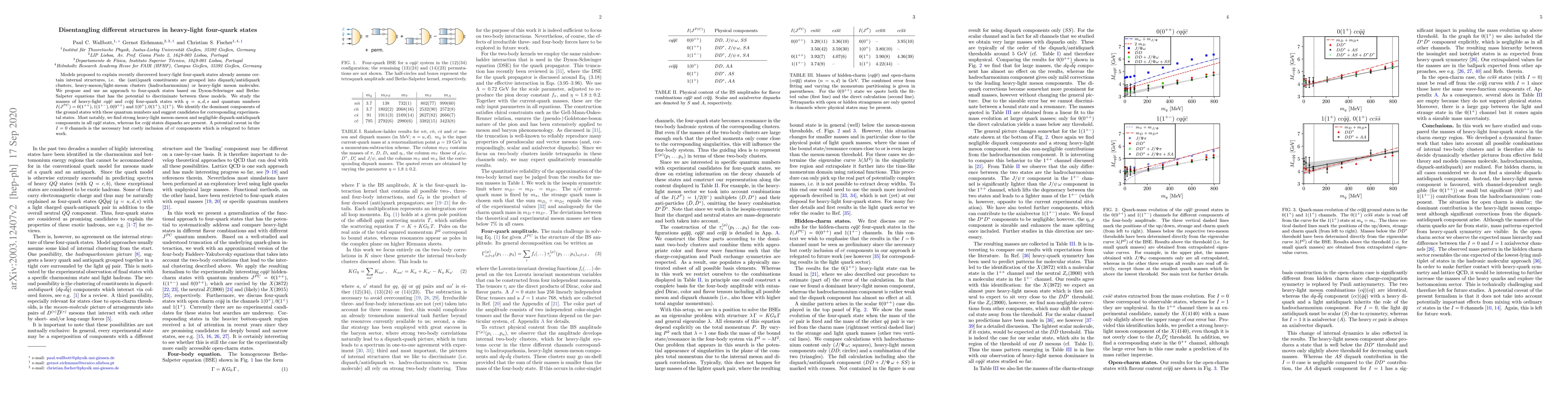 Models proposed to explain recently discovered heavy-light four-quark states already assume certain internal structures, i.e. the (anti)quark constituents are grouped into diquark/antidiquark clusters, heavy-meson/light-meson clusters (hadrocharmonium) or heavy-light meson molecules. We propose and use an approach to four-quark states based on Dyson-Schwinger and Bethe-Salpeter equations that has the potential to discriminate between these models. We study the masses of heavy-light $cq\bar{q}\bar{c}$ and $cc\bar{q}\bar{q}$ four-quark states with $q=u,d,s$ and quantum numbers $I(J^{PC})=0(1^{++}),1(1^{+-}),0(0^{++})$ and $1(0^+),0(1^+),1(1^+)$. We identify the dominant components of the ground states with these quantum numbers and suggest candidates for corresponding experimental states. Most notably, we find strong heavy-light meson-meson and negligible diquark-antidiquark components in all $cq\bar{q}\bar{c}$ states, whereas for $cc\bar{q}\bar{q}$ states diquarks are present. A potential caveat in the $I=0$ channels is the necessary but costly inclusion of $c\bar{c}$ components which is relegated to future work.