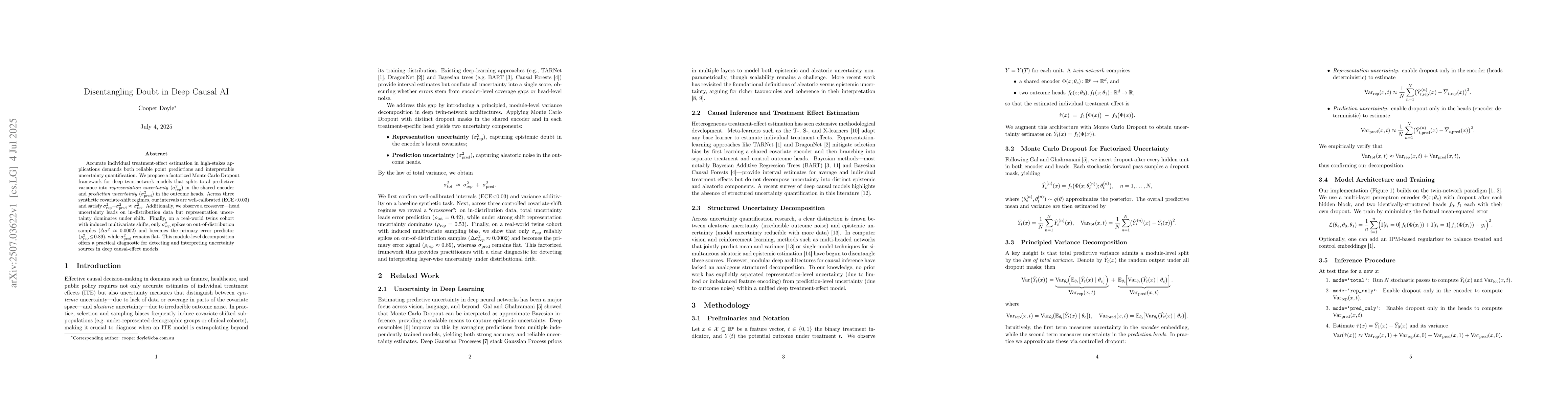Accurate individual treatment-effect estimation in high-stakes applications demands both reliable point predictions and interpretable uncertainty quantification. We propose a factorized Monte Carlo Dropout framework for deep twin-network models that splits total predictive variance into representation uncertainty (sigma_rep) in the shared encoder and prediction uncertainty (sigma_pred) in the outcome heads. Across three synthetic covariate-shift regimes, our intervals are well-calibrated (ECE < 0.03) and satisfy sigma_rep^2 + sigma_pred^2 ~ sigma_tot^2. Additionally, we observe a crossover: head uncertainty leads on in-distribution data, but representation uncertainty dominates under shift. Finally, on a real-world twins cohort with induced multivariate shifts, only sigma_rep spikes on out-of-distribution samples (delta sigma ~ 0.0002) and becomes the primary error predictor (rho_rep <= 0.89), while sigma_pred remains flat. This module-level decomposition offers a practical diagnostic for detecting and interpreting uncertainty sources in deep causal-effect models.