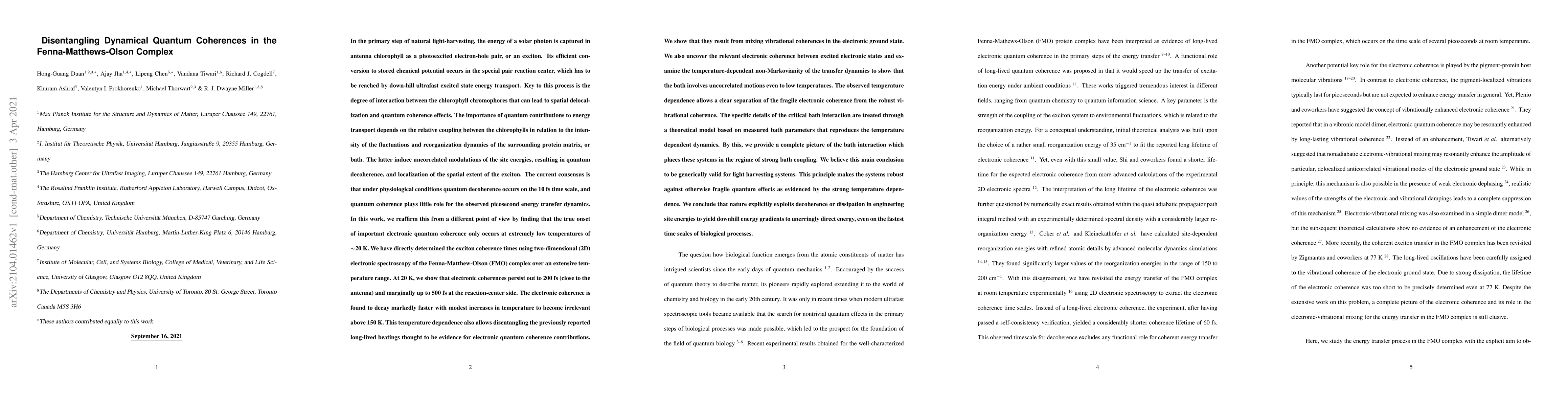 This paper investigates the quantum coherences in the Fenna-Matthews-Olson complex, finding that electronic coherences are only significant at extremely low temperatures (~20 K). At this temperature, coherences persist up to 200 fs near the antenna and up to 500 fs near the reaction center, but decay rapidly with increasing temperature, becoming irrelevant above 150 K.