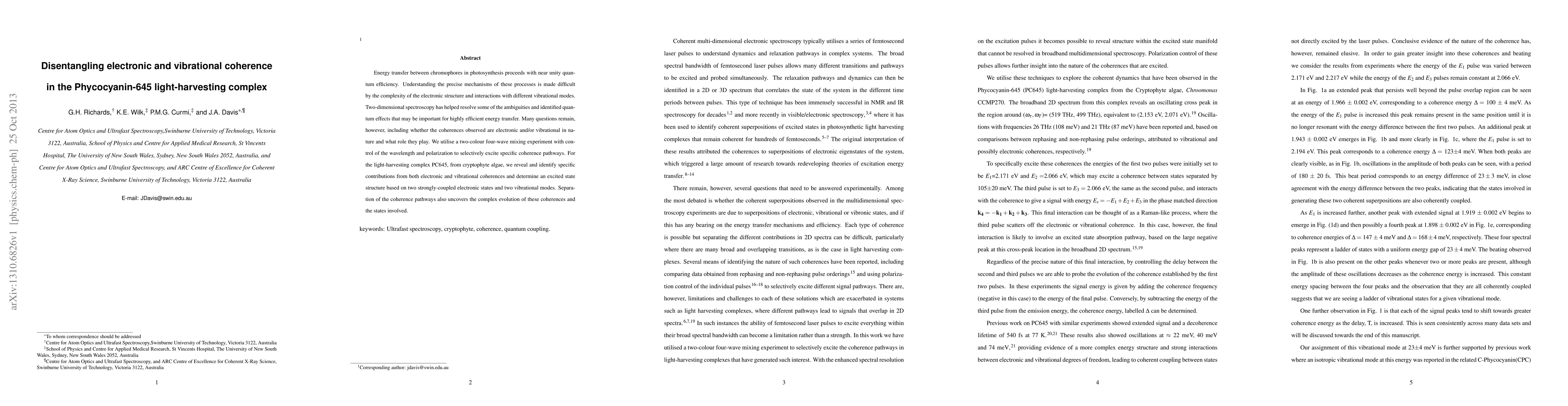 Energy transfer between chromophores in photosynthesis proceeds with near unity quantum efficiency. Understanding the precise mechanisms of these processes is made difficult by the complexity of the electronic structure and interactions with different vibrational modes. Two-dimensional spectroscopy has helped resolve some of the ambiguities and identified quantum effects that may be important for highly efficient energy transfer. Many questions remain, however, including whether the coherences observed are electronic and/or vibrational in nature and what role they play. We utilise a two-colour four-wave mixing experiment with control of the wavelength and polarization to selectively excite specific coherence pathways. For the light-harvesting complex PC645, from cryptophyte algae, we reveal and identify specific contributions from both electronic and vibrational coherences and determine an excited state structure based on two strongly-coupled electronic states and two vibrational modes. Separation of the coherence pathways also uncovers the complex evolution of these coherences and the states involved.