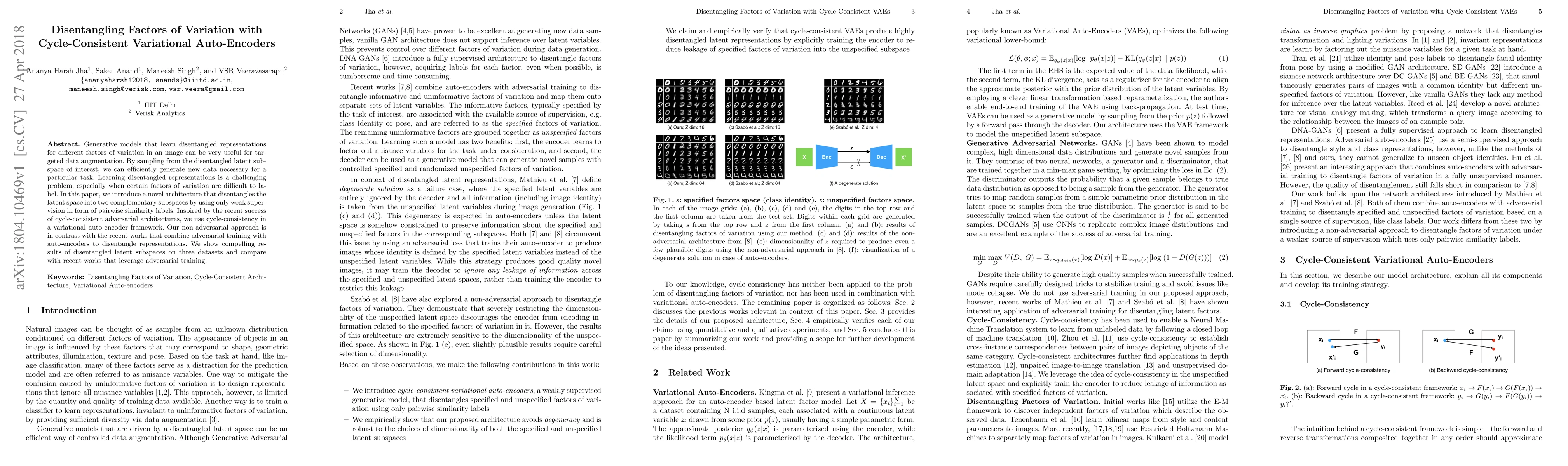 This paper proposes a cycle-consistent variational auto-encoder architecture for disentangling latent representations using only weak supervision in the form of pairwise similarity labels. Unlike adversarial methods, it achieves disentanglement without adversarial training, demonstrating effective results on three datasets.