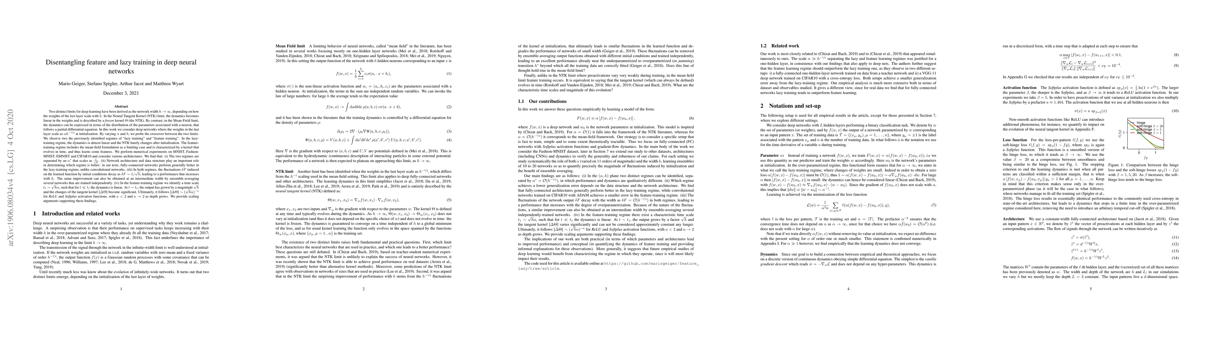 Two distinct limits for deep learning have been derived as the network width $h\rightarrow \infty$, depending on how the weights of the last layer scale with $h$. In the Neural Tangent Kernel (NTK) limit, the dynamics becomes linear in the weights and is described by a frozen kernel $\Theta$. By contrast, in the Mean-Field limit, the dynamics can be expressed in terms of the distribution of the parameters associated with a neuron, that follows a partial differential equation. In this work we consider deep networks where the weights in the last layer scale as $\alpha h^{-1/2}$ at initialization. By varying $\alpha$ and $h$, we probe the crossover between the two limits. We observe the previously identified regimes of lazy training and feature training. In the lazy-training regime, the dynamics is almost linear and the NTK barely changes after initialization. The feature-training regime includes the mean-field formulation as a limiting case and is characterized by a kernel that evolves in time, and learns some features. We perform numerical experiments on MNIST, Fashion-MNIST, EMNIST and CIFAR10 and consider various architectures. We find that (i) The two regimes are separated by an $\alpha^*$ that scales as $h^{-1/2}$. (ii) Network architecture and data structure play an important role in determining which regime is better: in our tests, fully-connected networks perform generally better in the lazy-training regime, unlike convolutional networks. (iii) In both regimes, the fluctuations $\delta F$ induced on the learned function by initial conditions decay as $\delta F\sim 1/\sqrt{h}$, leading to a performance that increases with $h$. The same improvement can also be obtained at an intermediate width by ensemble-averaging several networks. (iv) In the feature-training regime we identify a time scale $t_1\sim\sqrt{h}\alpha$, such that for $t\ll t_1$ the dynamics is linear.