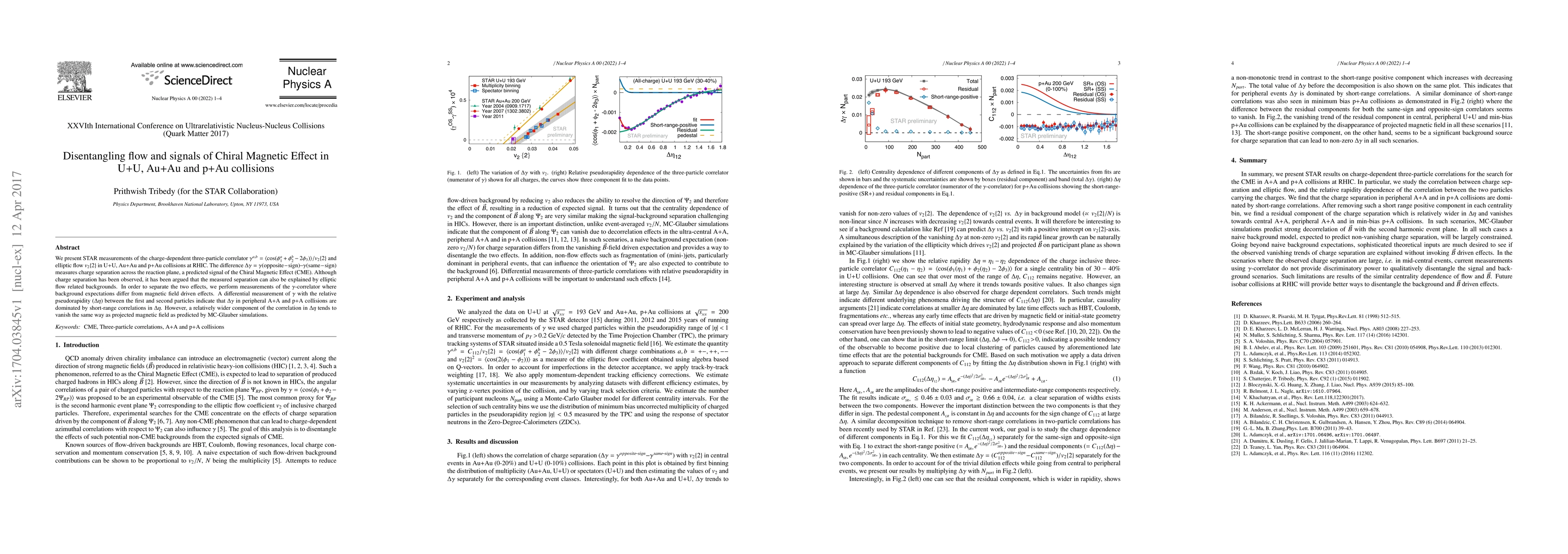 This paper reports STAR measurements of charge-dependent three-particle correlators and elliptic flow in various heavy-ion collisions, aiming to disentangle the Chiral Magnetic Effect from elliptic flow backgrounds. The observed charge separation is largely attributed to short-range correlations, while a wider component aligns with magnetic field predictions.