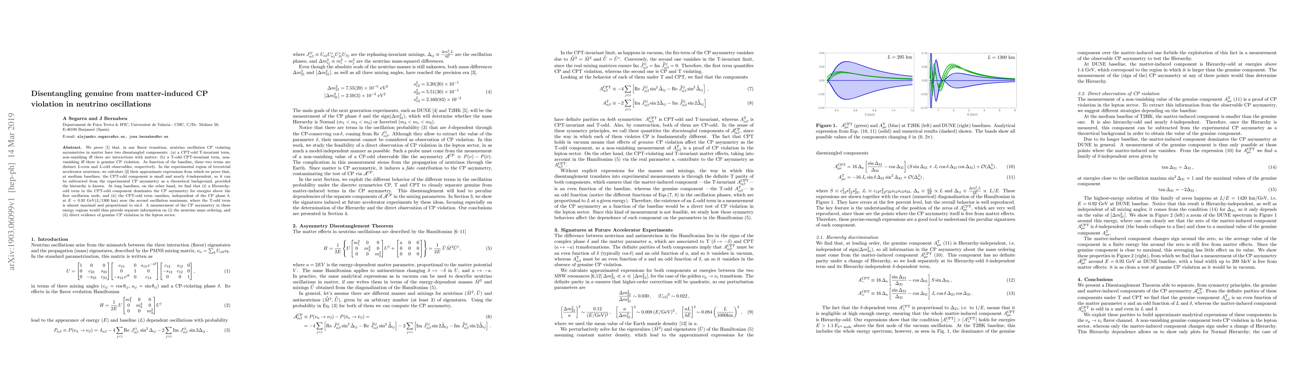 We prove that, in any flavor transition, neutrino oscillation CP violating asymmetries in matter have two disentangled components: (a) a CPT-odd T-invariant term, non-vanishing iff there are interactions with matter; (b) a T-odd CPT-invariant term, non-vanishing iff there is genuine CP violation. As function of the baseline, these two terms are distinct L-even and L-odd observables, respectively. In the experimental region of terrestrial accelerator neutrinos, we calculate their approximate expressions from which we prove that, at medium baselines, the CPT-odd component is small and nearly $\delta$-independent, so it can be subtracted from the experimental CP asymmetry as a theoretical background, provided the hierarchy is known. At long baselines, on the other hand, we find that (i) a Hierarchy-odd term in the CPT-odd component dominates the CP asymmetry for energies above the first oscillation node, and (ii) the CPT-odd term vanishes, independent of the CP phase $\delta$, at E = 0.92 GeV(L/1300 km) near the second oscillation maximum, where the T-odd term is almost maximal and proportional to $\sin\delta$. A measurement of the CP asymmetry in these energy regions would thus provide separate information on (i) the neutrino mass ordering, and (ii) direct evidence of genuine CP violation in the lepton sector.