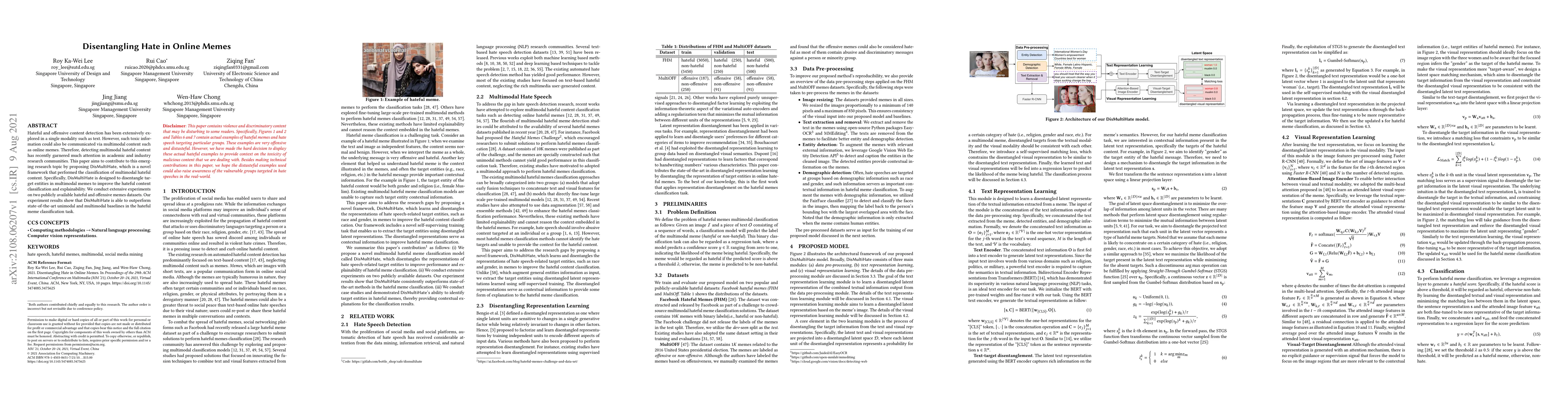 Hateful and offensive content detection has been extensively explored in a single modality such as text. However, such toxic information could also be communicated via multimodal content such as online memes. Therefore, detecting multimodal hateful content has recently garnered much attention in academic and industry research communities. This paper aims to contribute to this emerging research topic by proposing DisMultiHate, which is a novel framework that performed the classification of multimodal hateful content. Specifically, DisMultiHate is designed to disentangle target entities in multimodal memes to improve hateful content classification and explainability. We conduct extensive experiments on two publicly available hateful and offensive memes datasets. Our experiment results show that DisMultiHate is able to outperform state-of-the-art unimodal and multimodal baselines in the hateful meme classification task. Empirical case studies were also conducted to demonstrate DisMultiHate's ability to disentangle target entities in memes and ultimately showcase DisMultiHate's explainability of the multimodal hateful content classification task.