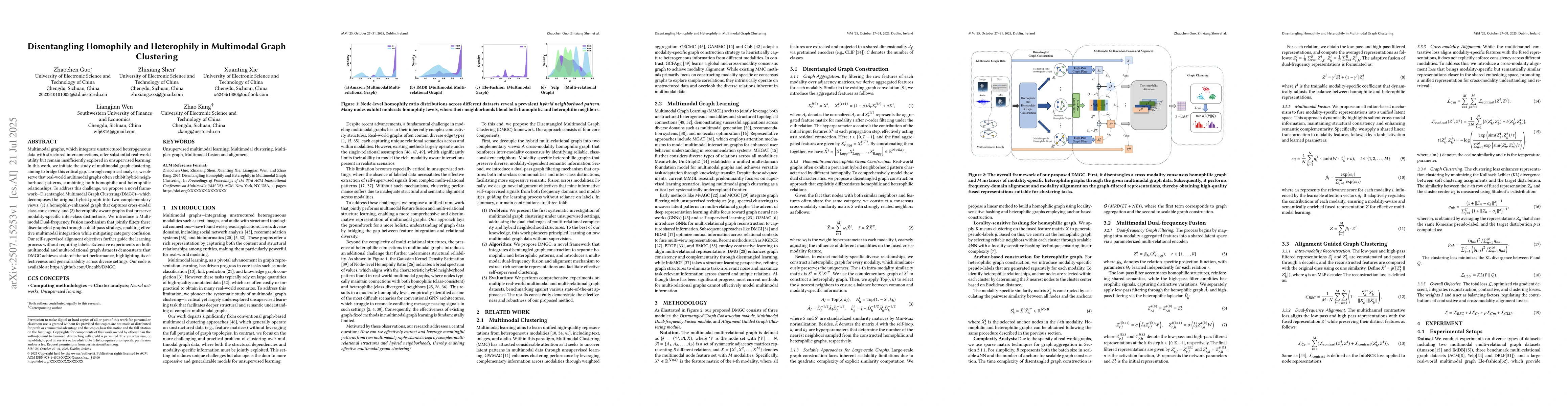 This work is novel by initiating the study of multimodal graph clustering, proposing a disentangling framework, and introducing a dual-pass strategy for fusion, which sets it apart from existing research focused primarily on homophily or heterophily in isolation.
