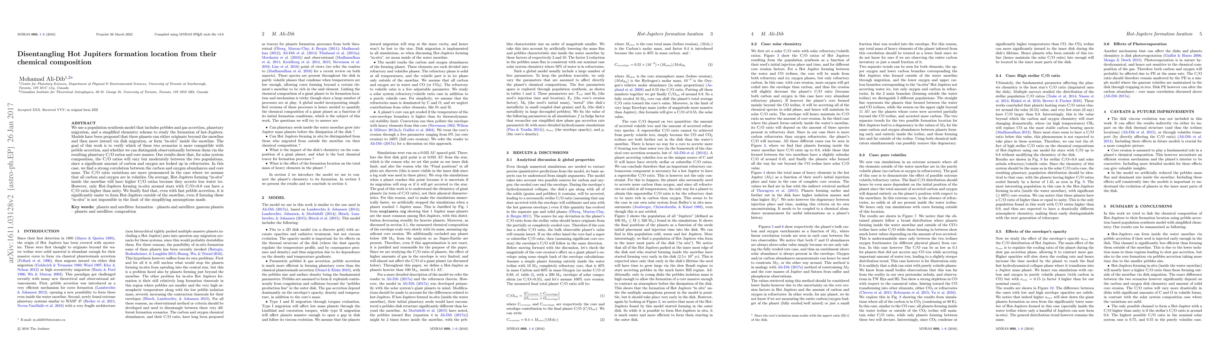 This study investigates the formation locations of hot Jupiters using a population synthesis model, finding that while hot Jupiters can form either beyond the snowline or in-situ within it, their C/O ratios and core masses provide limited observational distinction between the two scenarios. Hot Jupiters forming in-situ tend to have higher C/O ratios due to less water ice accretion.