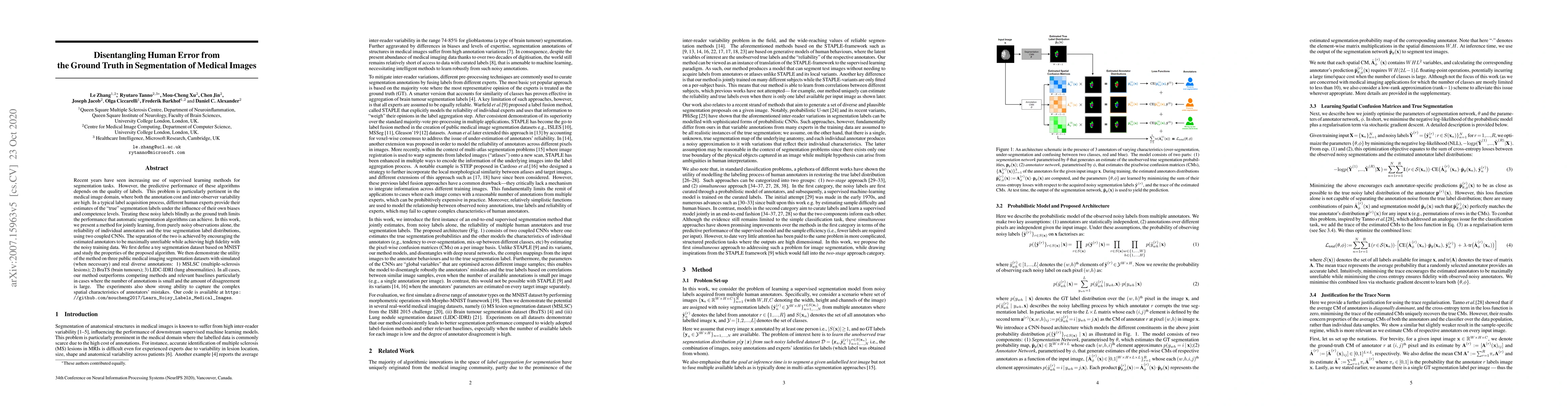 This paper proposes a method to disentangle human error from ground truth in medical image segmentation by jointly learning annotator reliability and true label distributions using coupled CNNs. The method outperforms competing approaches, especially in scenarios with limited annotations and high inter-annotator disagreement, as demonstrated on three medical imaging datasets.