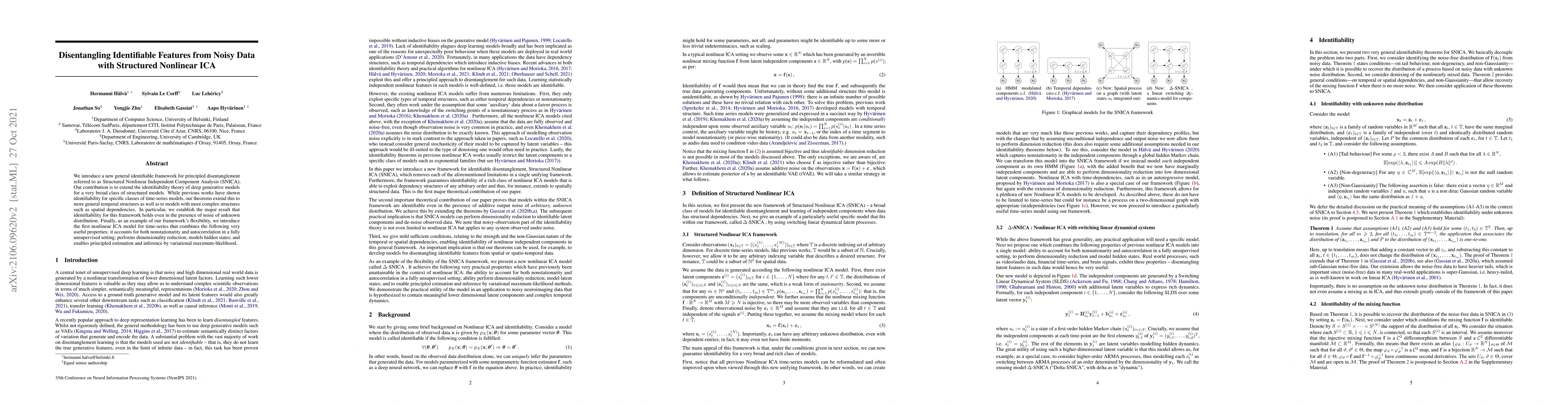 This paper introduces Structured Nonlinear Independent Component Analysis (SNICA) for disentangling identifiable features from noisy data, extending identifiability theory to a broad class of structured models, including temporal and spatial dependencies. The framework maintains identifiability even with unknown noise distributions and includes a nonlinear ICA model for time-series that handles nonstationarity, autocorrelation, dimensionality reduction, and hidden states via variational maximum-likelihood.