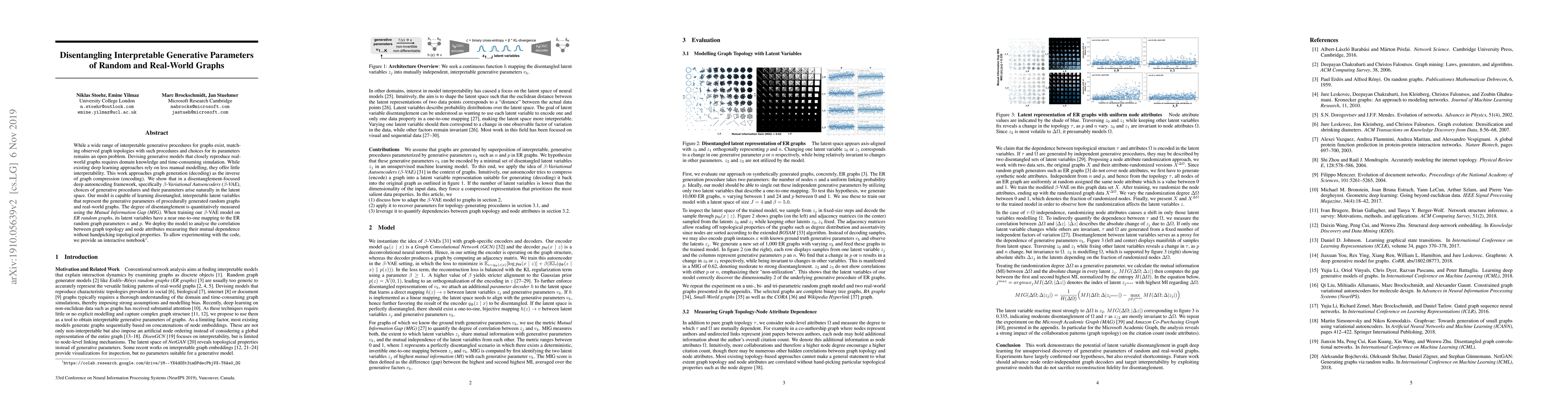 While a wide range of interpretable generative procedures for graphs exist, matching observed graph topologies with such procedures and choices for its parameters remains an open problem. Devising generative models that closely reproduce real-world graphs requires domain knowledge and time-consuming simulation. While existing deep learning approaches rely on less manual modelling, they offer little interpretability. This work approaches graph generation (decoding) as the inverse of graph compression (encoding). We show that in a disentanglement-focused deep autoencoding framework, specifically Beta-Variational Autoencoders (Beta-VAE), choices of generative procedures and their parameters arise naturally in the latent space. Our model is capable of learning disentangled, interpretable latent variables that represent the generative parameters of procedurally generated random graphs and real-world graphs. The degree of disentanglement is quantitatively measured using the Mutual Information Gap (MIG). When training our Beta-VAE model on ER random graphs, its latent variables have a near one-to-one mapping to the ER random graph parameters n and p. We deploy the model to analyse the correlation between graph topology and node attributes measuring their mutual dependence without handpicking topological properties.