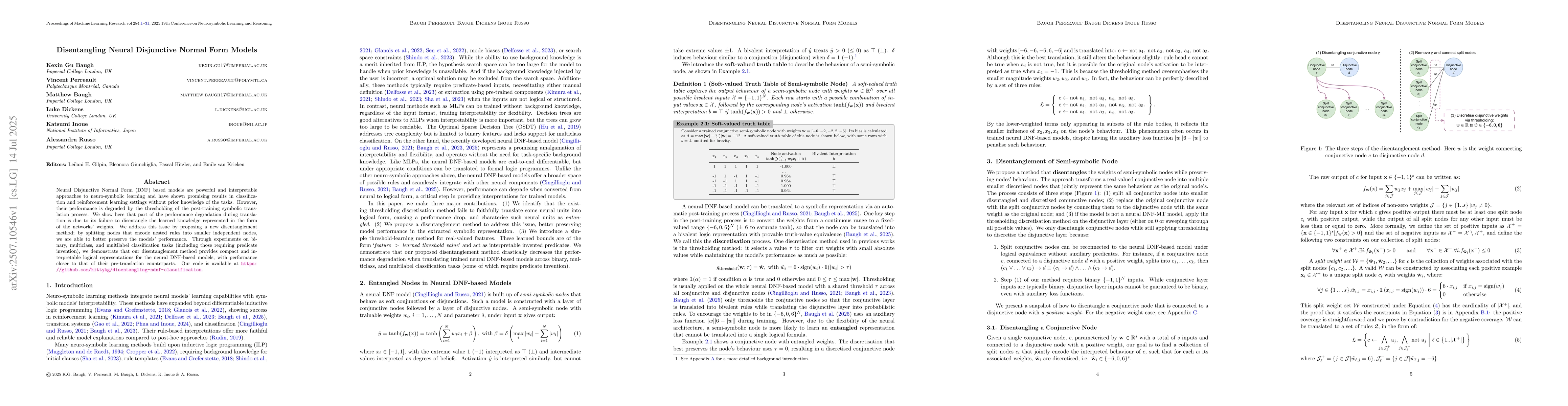 Neural Disjunctive Normal Form (DNF) based models are powerful and interpretable approaches to neuro-symbolic learning and have shown promising results in classification and reinforcement learning settings without prior knowledge of the tasks. However, their performance is degraded by the thresholding of the post-training symbolic translation process. We show here that part of the performance degradation during translation is due to its failure to disentangle the learned knowledge represented in the form of the networks' weights. We address this issue by proposing a new disentanglement method; by splitting nodes that encode nested rules into smaller independent nodes, we are able to better preserve the models' performance. Through experiments on binary, multiclass, and multilabel classification tasks (including those requiring predicate invention), we demonstrate that our disentanglement method provides compact and interpretable logical representations for the neural DNF-based models, with performance closer to that of their pre-translation counterparts. Our code is available at https://github.com/kittykg/disentangling-ndnf-classification.