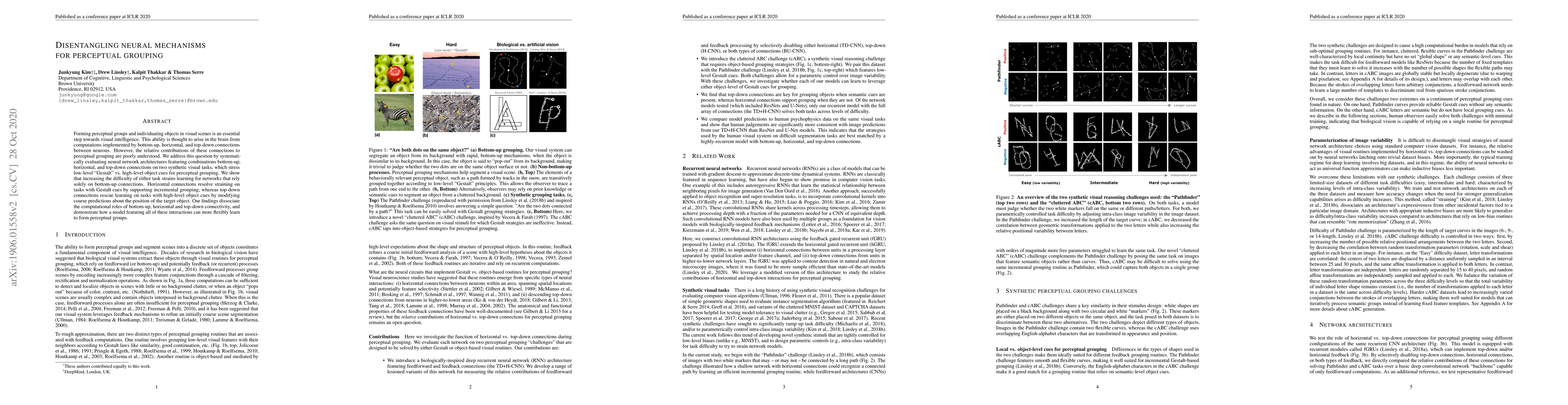This paper investigates neural mechanisms for perceptual grouping by evaluating neural network architectures with different connectivity types on visual tasks. It finds that horizontal connections aid incremental grouping, while top-down connections enhance learning for high-level object cues, demonstrating the distinct roles of various neural connections in perceptual grouping.