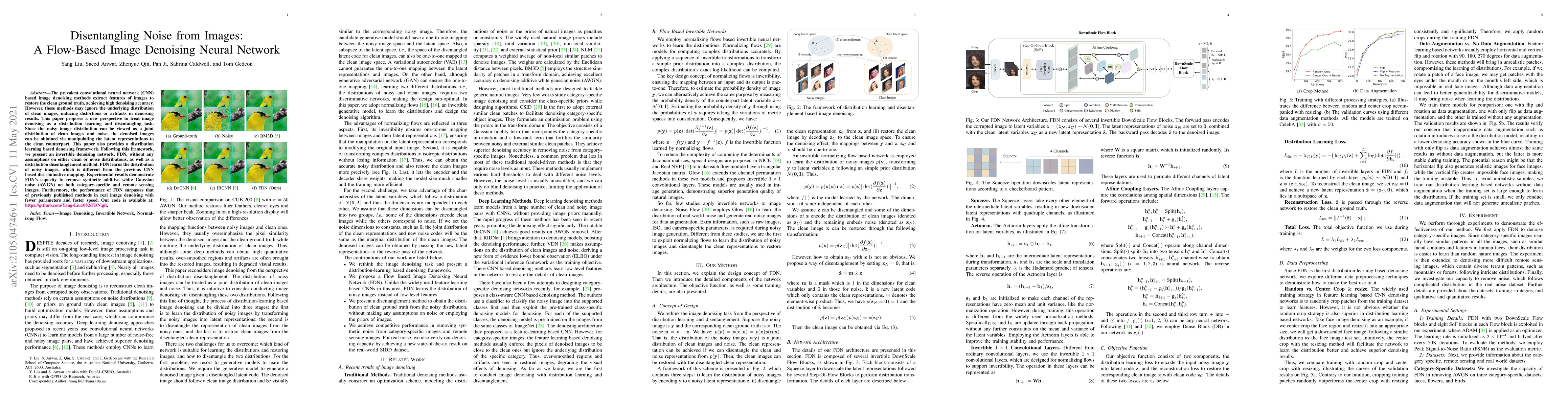 This paper proposes an invertible denoising network, FDN, which treats image denoising as a distribution learning and disentanglement task, aiming to manipulate latent representations to recover clean images without assuming any specific distributions. Experimental results show FDN's superior performance in denoising both synthetic and real images with fewer parameters and faster speed compared to previous CNN-based methods.