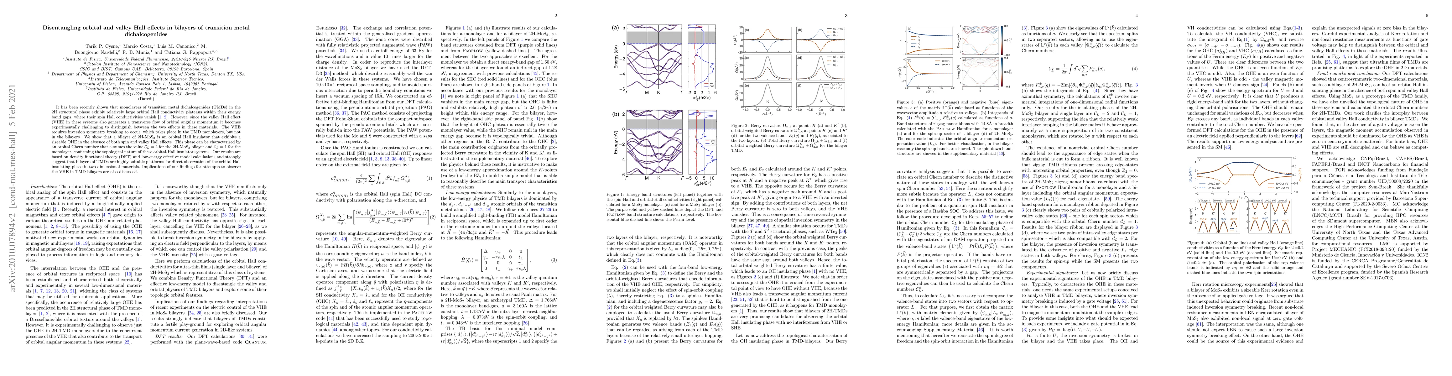 This paper demonstrates that bilayers of 2H-MoS$_2$ exhibit a sizeable orbital Hall effect (OHE) without spin or valley Hall effects, characterized by an orbital Chern number. The findings suggest bilayer TMDs as ideal platforms for observing the orbital Hall insulating phase.