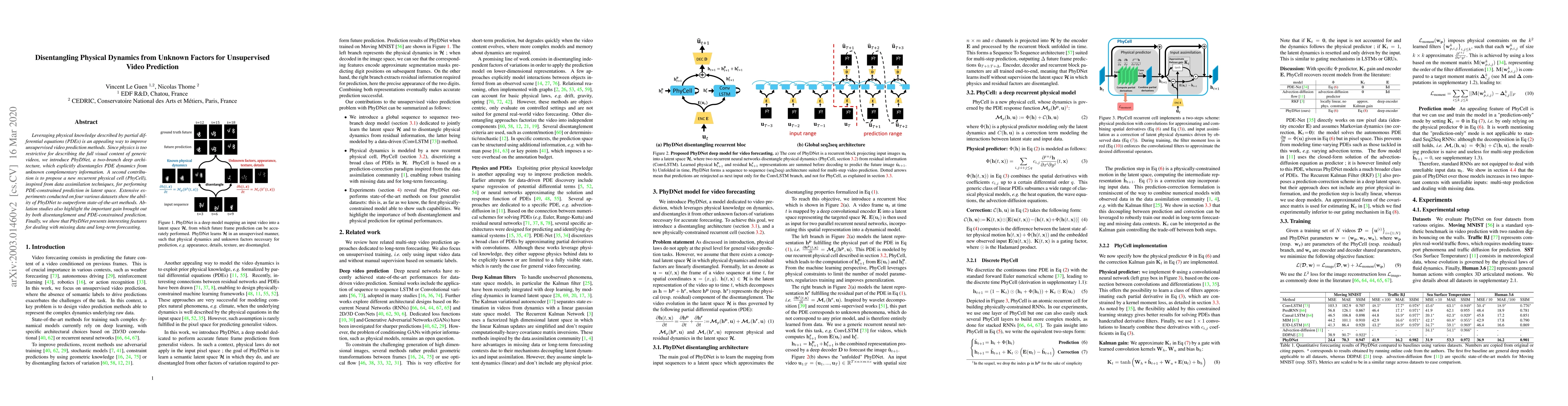 Researchers developed a new video prediction model called PhyDNet that uses physical knowledge to improve accuracy, outperforming existing methods on four datasets. The model disentangles physical dynamics from unknown factors, making it useful for handling missing data and long-term forecasting.