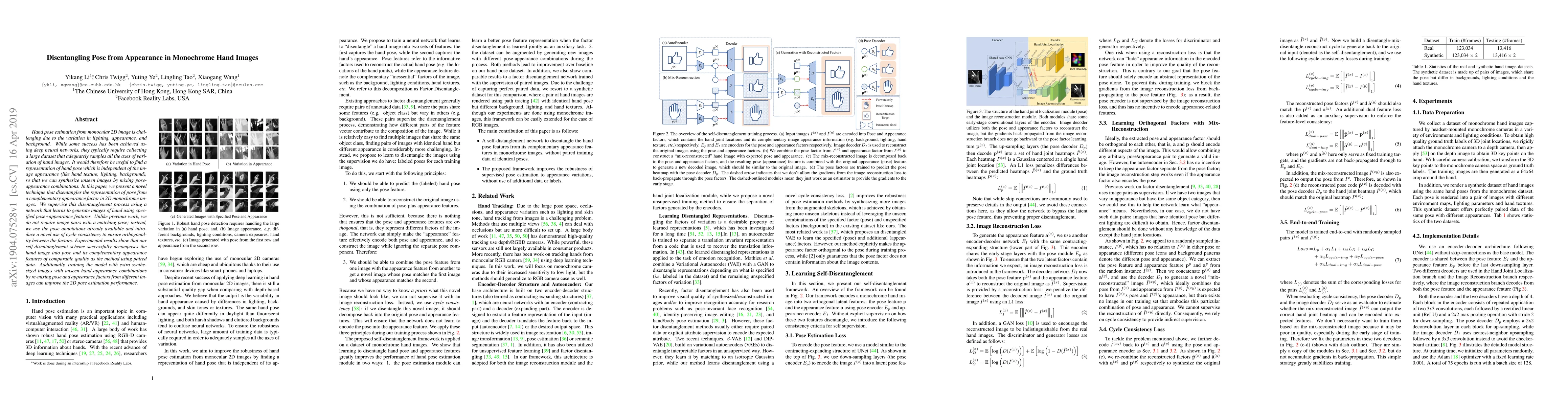 This paper introduces a novel technique to disentangle pose from appearance in monochrome hand images, achieving this without requiring paired data. The method uses cycle consistency to ensure orthogonality between pose and appearance factors, leading to improved 2D pose estimation performance when trained with synthesized images.