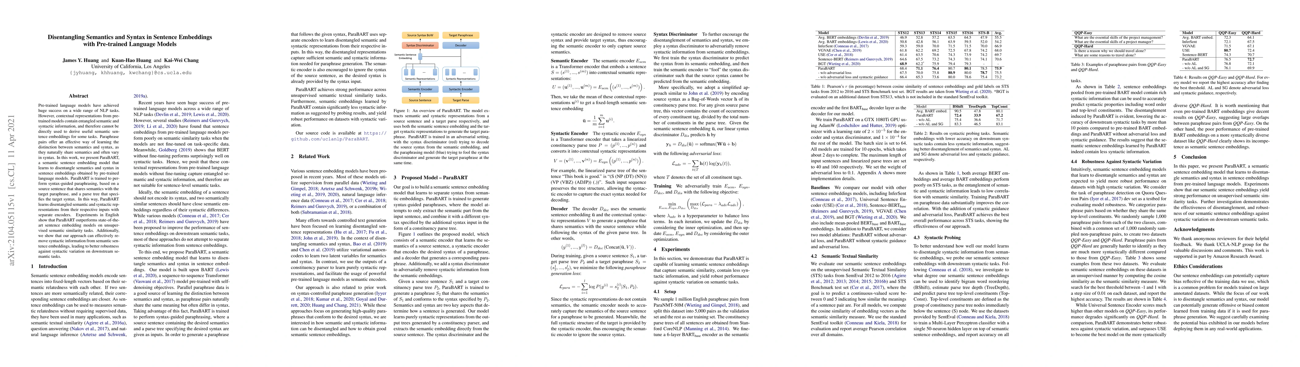 This paper introduces ParaBART, a model that disentangles semantic and syntactic information in sentence embeddings from pre-trained language models, leveraging paraphrase pairs and syntax-guided paraphrasing. ParaBART outperforms existing models in unsupervised semantic similarity tasks and enhances robustness against syntactic variations.