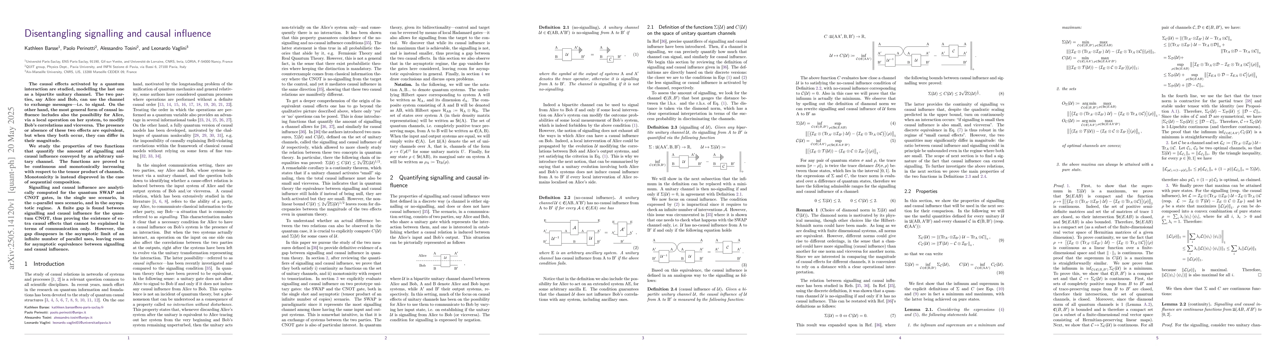 Researchers investigate how quantum interactions can both facilitate communication (signalling) and influence each other's systems (causal influence), finding a finite gap between these effects for some gates but an asymptotic equivalence in the limit of many parallel uses.