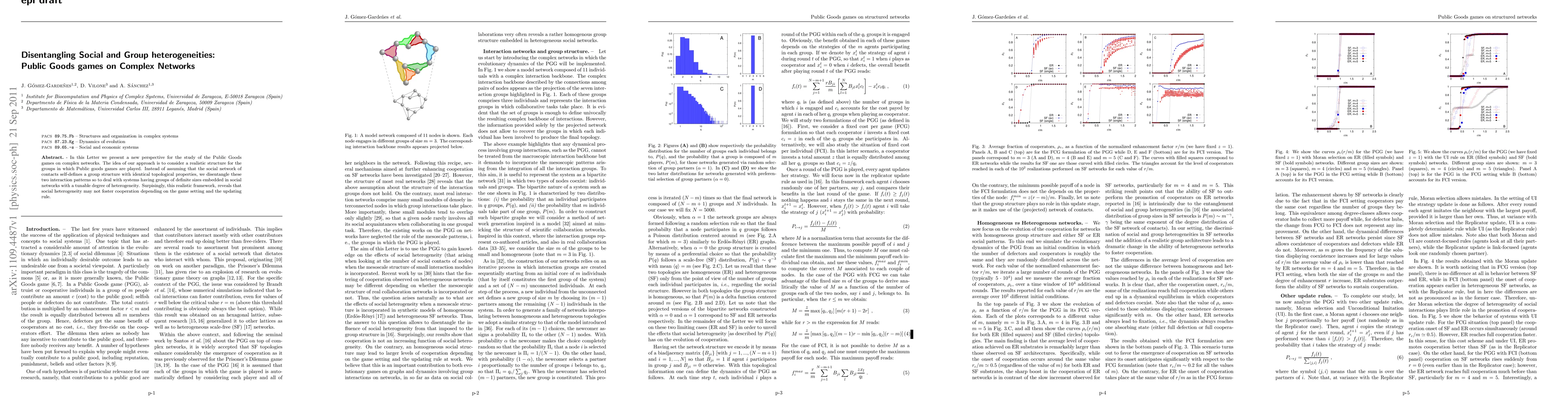 This paper explores Public Goods games on complex networks by distinguishing social and group heterogeneities, revealing that social heterogeneity does not necessarily promote cooperation, depending on the game setting and updating rule. The study suggests a more realistic group structure within social networks, showing varied effects on cooperation.