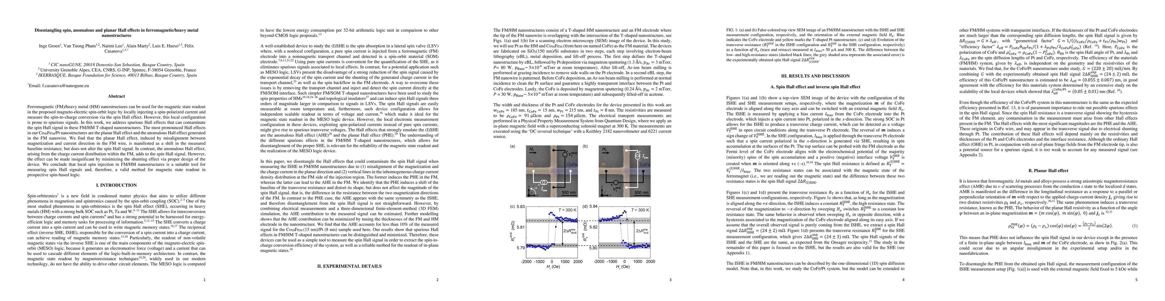 This research disentangles spin, anomalous, and planar Hall effects in ferromagnetic/heavy metal nanostructures, finding that while the planar Hall effect shifts baseline resistance without affecting spin Hall signals, the anomalous Hall effect can be minimized through device design, confirming local spin injection as a viable method for magnetic state readout in spin-based logic.