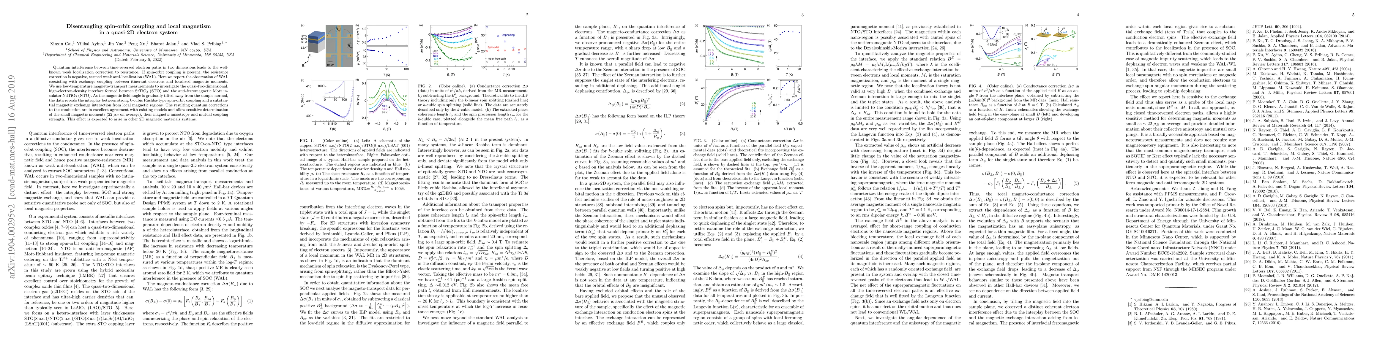 Quantum interference between time-reversed electron paths in two dimensions leads to the well-known weak localization correction to resistance. If spin-orbit coupling is present, the resistance correction is negative, termed weak anti-localization (WAL). Here we report the observation of WAL coexisting with exchange coupling between itinerant electrons and localized magnetic moments. We use low-temperature magneto-transport measurements to investigate the quasi-two-dimensional, high-electron-density interface formed between SrTiO$_3$ (STO) and the anti-ferromagnetic Mott insulator NdTiO$_3$ (NTO). As the magnetic field angle is gradually tilted away from the sample normal, the data reveals the interplay between strong $k$-cubic Rashba-type spin-orbit coupling and a substantial magnetic exchange interaction from local magnetic regions. The resulting quantum corrections to the conduction are in excellent agreement with existing models and allow sensitive determination of the small magnetic moments (22 $\mu_B$ on average), their magnetic anisotropy and mutual coupling strength. This effect is expected to arise in other 2D magnetic materials systems.