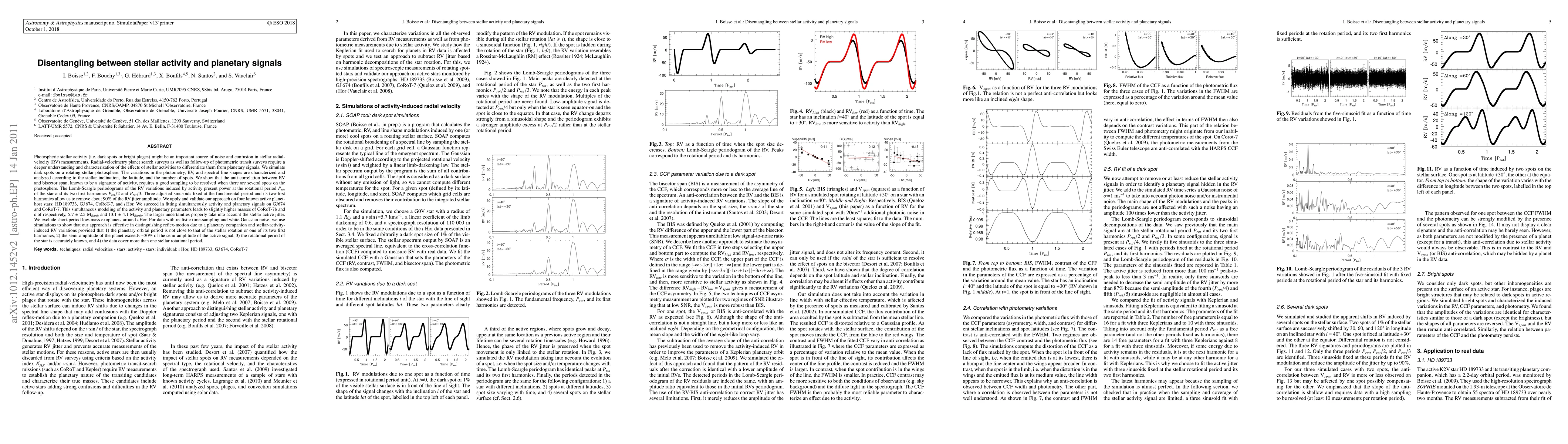 Photospheric stellar activity might be an important source of noise and confusion in the radial-velocity measurements. RV planet search surveys as well as follow-up of photometric transit surveys require a deeper understanding and characterization of the effects of stellar activities to disentangle it from planetary signals. We simulate dark spots on a rotating stellar photosphere. The variations of the photometry, RV and spectral line shapes are characterized and analyzed according to the stellar inclination, the latitude and the number of spots. The Lomb-Scargle periodograms of the RV variations induced by activity present power at the rotational period Prot of the star and its two-first harmonics Prot/2 and Prot/3. Three adjusted sinusoids fixed at Prot and its two-first harmonics allow to remove about 90% of the RV jitter amplitude. We apply and validate our approach on four known active planet-host stars: HD189733, GJ674, CoRoT-7 and iHor. We succeed in fitting simultaneously activity and planetary signals on GJ674 and CoRoT-7. This simultaneous modeling of the activity and planetary parameters leads to slightly larger masses of CoRoT-7b and c: respectively, 5.7+/-2.5ME and 13.1+/-4.1ME. The larger uncertainties take into account properly for the stellar active jitter. We excluded short-period low-mass exoplanets around iHor. For data with realistic time-sampling and white Gaussian noise, we use simulations to show that our approach is efficient to disentangle reflex-motion due to a planetary companion and stellar-activity induced-RV variations provided that 1) the planetary orbital period is not close to that of the stellar rotation or one of its two-first harmonics 2) the semi-amplitude of the planet exceeds 30% of the semi-amplitude of the active signal 3) the rotational period of the star is accurately known 4) the data cover more than one stellar rotational period.