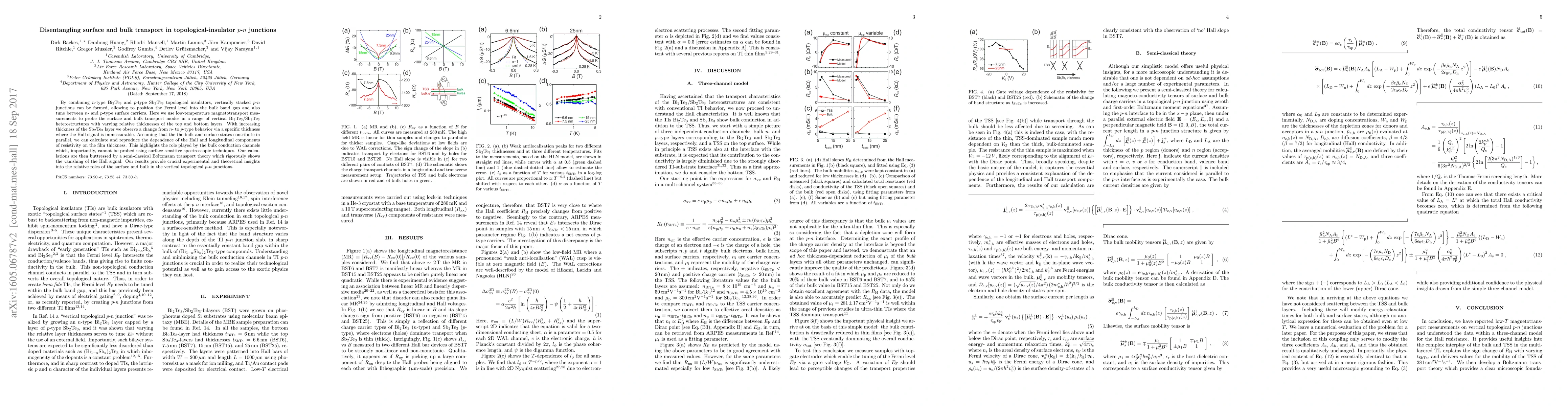 By combining $n$-type $\mathrm{Bi_2Te_3}$ and $p$-type $\mathrm{Sb_2Te_3}$ topological insulators, vertically stacked $p$-$n$ junctions can be formed, allowing to position the Fermi level into the bulk band gap and also tune between $n$- and $p$-type surface carriers. Here we use low-temperature magnetotransport measurements to probe the surface and bulk transport modes in a range of vertical $\mathrm{Bi_2Te_3/Sb_2Te_3}$ heterostructures with varying relative thicknesses of the top and bottom layers. With increasing thickness of the $\mathrm{Sb_2Te_3}$ layer we observe a change from $n$- to $p$-type behavior via a specific thickness where the Hall signal is immeasurable. Assuming that the the bulk and surface states contribute in parallel, we can calculate and reproduce the dependence of the Hall and longitudinal components of resistivity on the film thickness. This highlights the role played by the bulk conduction channels which, importantly, cannot be probed using surface sensitive spectroscopic techniques. Our calculations are then buttressed by a semi-classical Boltzmann transport theory which rigorously shows the vanishing of the Hall signal. Our results provide crucial experimental and theoretical insights into the relative roles of the surface and bulk in the vertical topological $p$-$n$ junctions.