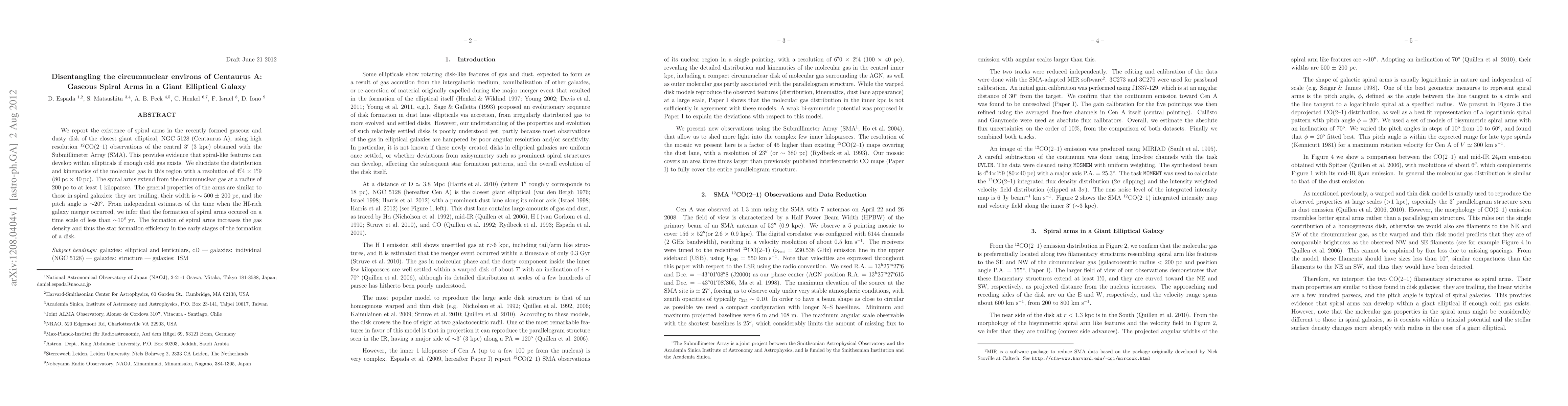 We report the existence of spiral arms in the recently formed gaseous and dusty disk of the closest giant elliptical, NGC 5128 (Centaurus A), using high resolution 12CO(2-1) observations of the central 3 arcmin (3 kpc) obtained with the Submillimeter Array (SMA). This provides evidence that spiral-like features can develop within ellipticals if enough cold gas exists. We elucidate the distribution and kinematics of the molecular gas in this region with a resolution of 4.4 x 1.9 (80 pc x 40 pc). The spiral arms extend from the circumnuclear gas at a radius of 200 pc to at least 1 kiloparsec. The general properties of the arms are similar to those in spiral galaxies: they are trailing, the width is \sim 500 \pm 200 pc, and the pitch angle is 20 degrees. From independent estimates of the time when the HI-rich galaxy merger occurred, we infer that the formation of spiral arms happened on a time scale of less than \sim10^8 yr. The formation of spiral arms increases the gas density and thus the star formation efficiency in the early stages of the formation of a disk.