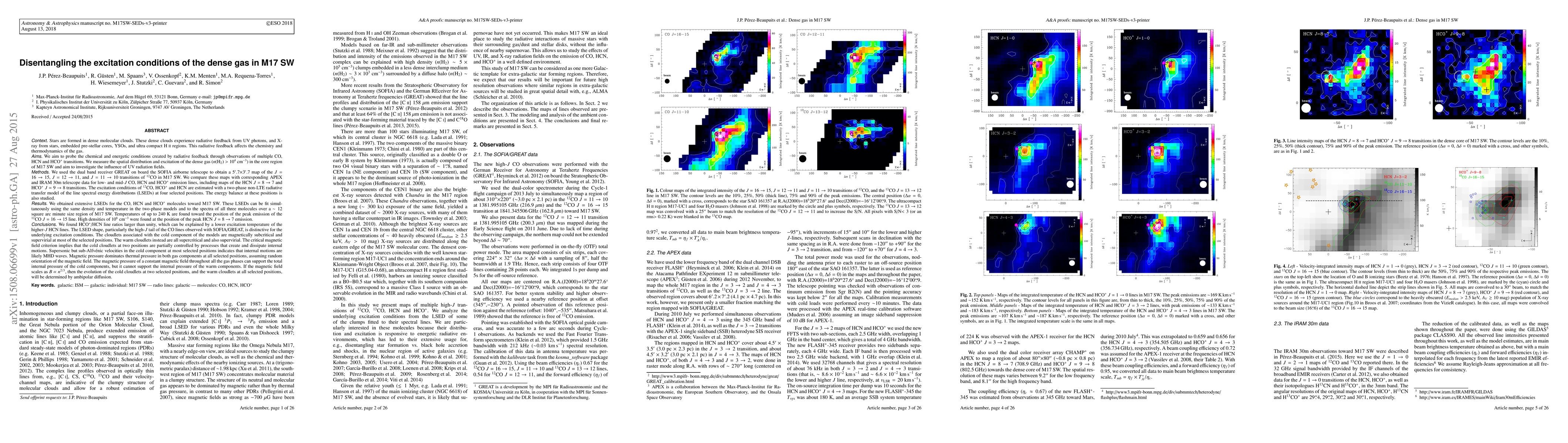 We probe the chemical and energetic conditions in dense gas created by radiative feedback through observations of multiple CO, HCN and HCO$^+$ transitions toward the dense core of M17 SW. We used the dual band receiver GREAT on board the SOFIA airborne telescope to obtain maps of the $J=16-15$, $J=12-11$, and $J=11-10$ transitions of $^{12}$CO. We compare these maps with corresponding APEX and IRAM 30m telescope data for low- and mid-$J$ CO, HCN and HCO$^+$ emission lines, including maps of the HCN $J=8-7$ and HCO$^+$ $J=9-8$ transitions. The excitation conditions of $^{12}$CO, HCO$^+$ and HCN are estimated with a two-phase non-LTE radiative transfer model of the line spectral energy distributions (LSEDs) at four selected positions. The energy balance at these positions is also studied. We obtained extensive LSEDs for the CO, HCN and HCO$^+$ molecules toward M17 SW. The LSED shape, particularly the high-$J$ tail of the CO lines observed with SOFIA/GREAT, is distinctive for the underlying excitation conditions. The critical magnetic field criterion implies that the cold cloudlets at two positions are partially controlled by processes that create and dissipate internal motions. Supersonic but sub-Alfv\'enic velocities in the cold component at most selected positions indicates that internal motions are likely MHD waves. Magnetic pressure dominates thermal pressure in both gas components at all selected positions, assuming random orientation of the magnetic field. The magnetic pressure of a constant magnetic field throughout all the gas phases can support the total internal pressure of the cold components, but it cannot support the internal pressure of the warm components. If the magnetic field scales as $B \propto n^{2/3}$, then the evolution of the cold cloudlets at two selected positions, and the warm cloudlets at all selected positions, will be determined by ambipolar diffusion.
