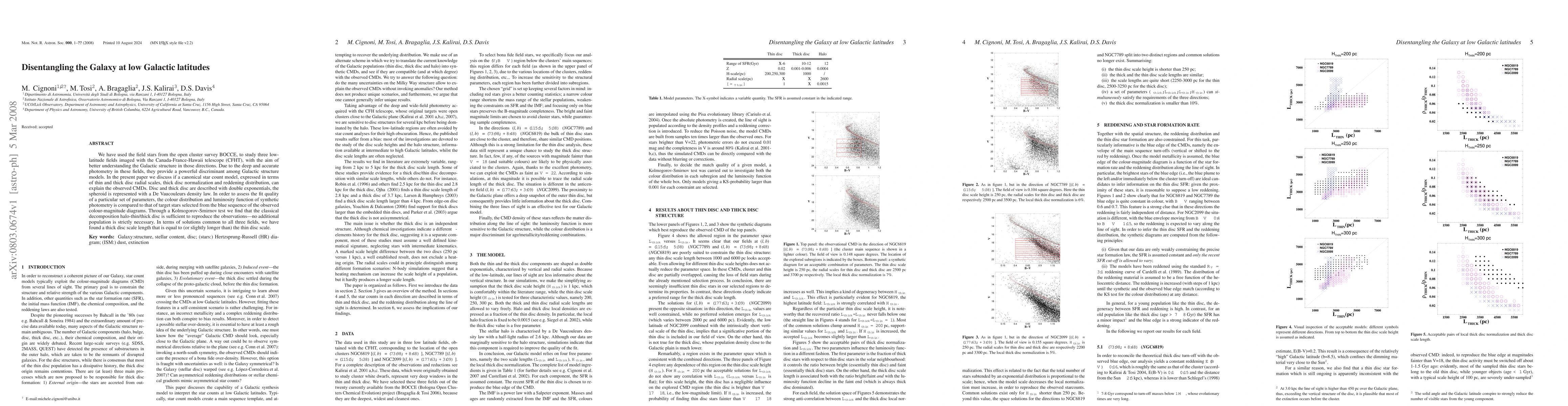 We have used the field stars from the open cluster survey BOCCE, to study three low-latitude fields imaged with the Canada-France-Hawaii telescope (CFHT), with the aim of better understanding the Galactic structure in those directions. Due to the deep and accurate photometry in these fields, they provide a powerful discriminant among Galactic structure models. In the present paper we discuss if a canonical star count model, expressed in terms of thin and thick disc radial scales, thick disc normalization and reddening distribution, can explain the observed CMDs. Disc and thick disc are described with double exponentials, the spheroid is represented with a De Vaucouleurs density law. In order to assess the fit quality of a particular set of parameters, the colour distribution and luminosity function of synthetic photometry is compared to that of target stars selected from the blue sequence of the observed colour-magnitude diagrams. Through a Kolmogorov-Smirnov test we find that the classical decomposition halo-thin/thick disc is sufficient to reproduce the observations--no additional population is strictly necessary. In terms of solutions common to all three fields, we have found a thick disc scale length that is equal to (or slightly longer than) the thin disc scale.