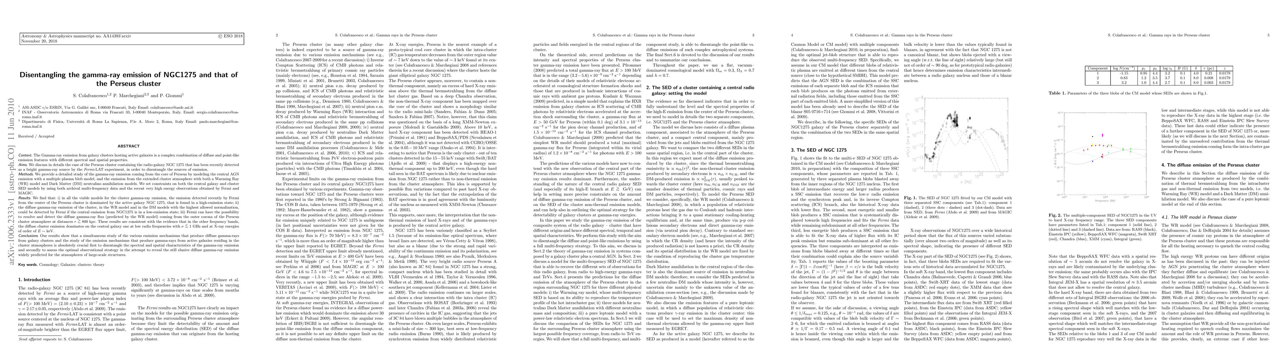 (Abridged). The gamma-ray emission from galaxy clusters hosting active galaxies is a complex combination of diffuse and point-like emission with different spectral and spatial properties. We discuss the case of the Perseus cluster containing the radio-galaxy NGC 1275 that has been detected as a bright gamma-ray source by the Fermi-LAT experiment. We provide a detailed study of the gamma-ray emission coming from the core of Perseus by modeling the central AGN emission with a multiple plasma blob model, and the emission from the cluster atmosphere with both a Warming Ray (WR) model and Dark Matter (DM) neutralino annihilation models. We set constraints on both the central galaxy and cluster SED models by using multi-frequency data including the observations obtained by Fermi and MAGIC. We find that: i) in all the viable models for the cluster gamma-ray emission, the emission detected by Fermi from the Perseus core is dominated by the active galaxy NGC 1275, that is found in a high-emission state; ii) the diffuse gamma-ray emission of the cluster, in the WR model and in the DM models with the highest allowed normalization, could be detected by Fermi if the central emission from NGC1275 is in a low-emission state; iii) Fermi can have the possibility to resolve and detect the diffuse gamma-ray flux coming from the outer corona of the Perseus atmosphere at r> 800 kpc. Our results show that a simultaneous study of the various emission mechanisms that produce diffuse gamma-rays from galaxy clusters and those producing gamma-rays from active galaxies residing in the cluster atmospheres is crucial first to disentangle the spectral and spatial characteristics of the gamma-ray emission and secondly to assess the optimal observational strategy in the attempt to reveal the still elusive diffuse gamma-ray emission widely predicted for the atmospheres of large-scale structures.