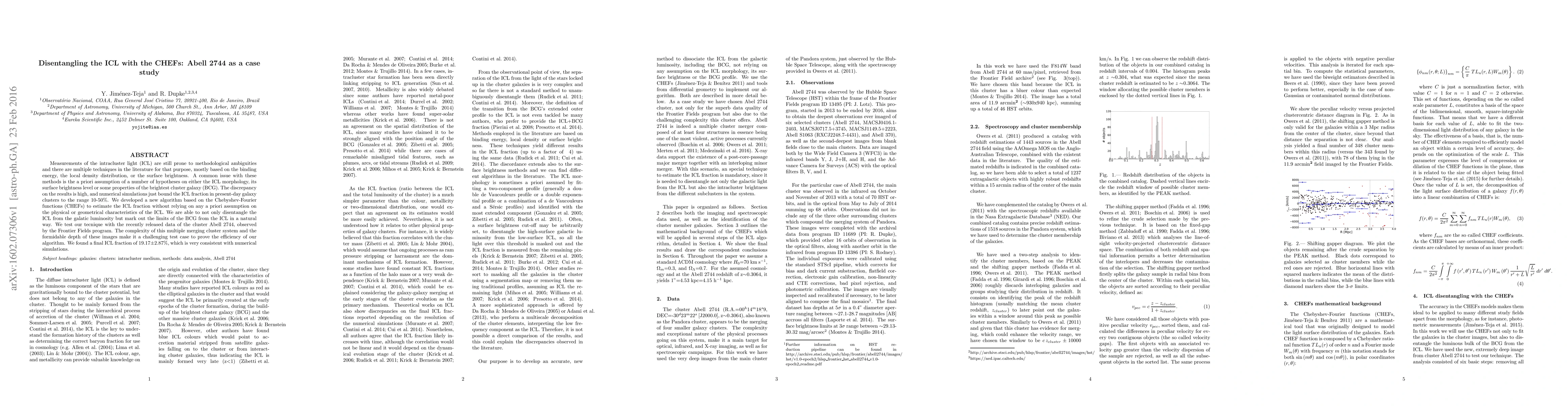 Measurements of the intracluster light (ICL) are still prone to methodological ambiguities and there are multiple techniques in the literature for that purpose, mostly based on the binding energy, the local density distribution, or the surface brightness. A common issue with these methods is the a priori assumption of a number of hypotheses on either the ICL morphology, its surface brightness level or some properties of the brightest cluster galaxy (BCG). The discrepancy on the results is high, and numerical simulations just bound the ICL fraction in present-day galaxy clusters to the range 10-50%. We developed a new algorithm based on the Chebyshev-Fourier functions (CHEFs) to estimate the ICL fraction without relying on any a priori assumption on the physical or geometrical characteristics of the ICL. We are able to not only disentangle the ICL from the galatic luminosity but mark out the limits of the BCG from the ICL in a natural way. We test our tecnique with the recently released data of the cluster Abell 2744, observed by the Frontier Fields program. The complexity of this multiple merging cluster system and the formidable depth of these images make it a challenging test case to prove the efficiency of our algorithm. We found a final ICL fraction of 19.17+-2.87%, which is very consistent with numerical simulations.