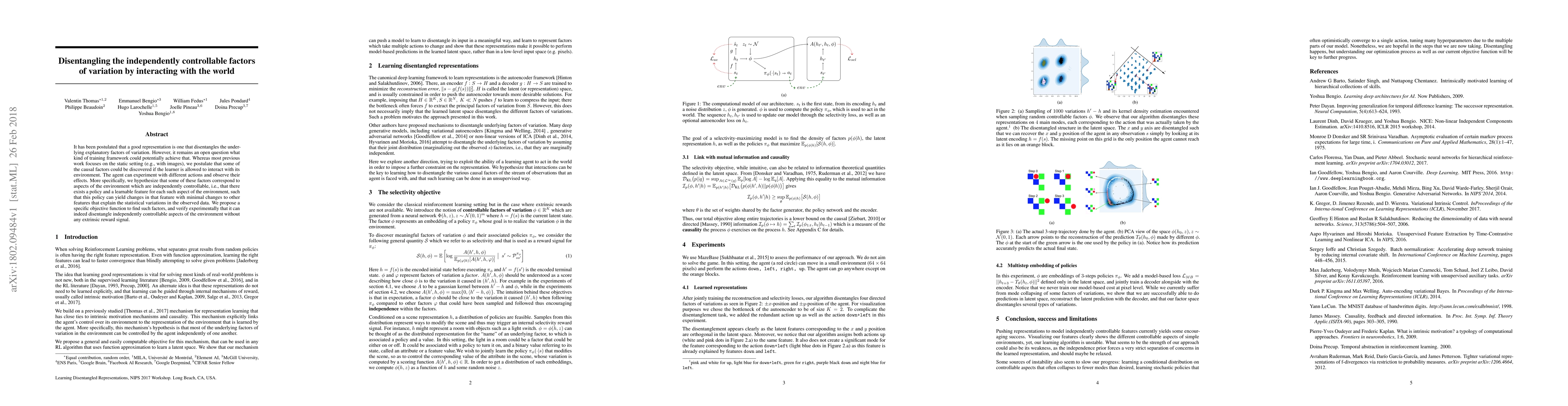 It has been postulated that a good representation is one that disentangles the underlying explanatory factors of variation. However, it remains an open question what kind of training framework could potentially achieve that. Whereas most previous work focuses on the static setting (e.g., with images), we postulate that some of the causal factors could be discovered if the learner is allowed to interact with its environment. The agent can experiment with different actions and observe their effects. More specifically, we hypothesize that some of these factors correspond to aspects of the environment which are independently controllable, i.e., that there exists a policy and a learnable feature for each such aspect of the environment, such that this policy can yield changes in that feature with minimal changes to other features that explain the statistical variations in the observed data. We propose a specific objective function to find such factors, and verify experimentally that it can indeed disentangle independently controllable aspects of the environment without any extrinsic reward signal.