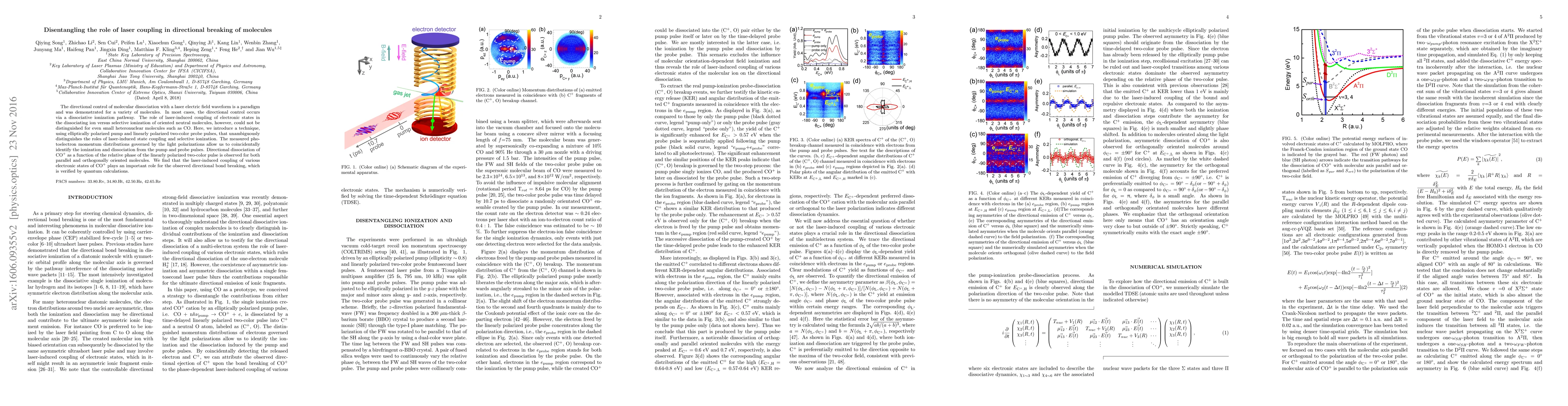 The directional control of molecular dissociation with the laser electric field waveform is a paradigm and was demonstrated for a variety of molecules. In most cases, the directional control occurs via a dissociative ionization pathway. The role of laser-induced coupling of electronic states in the dissociating ion versus selective ionization of oriented neutral molecules, however, could not be distinguished for even small heteronuclear molecules such as CO. Here, we introduce a technique, using elliptically polarized pump and linearly polarized two-color probe pulses that unambiguously distinguishes the roles of laser-induced state coupling and selective ionization. The measured photoelectron momentum distributions governed by the light polarizations allow us to coincidently identify the ionization and dissociation from the pump and probe pulses. Directional dissociation of CO+ as a function of the relative phase of the linearly polarized two-color pulse is observed for both parallel and orthogonally oriented molecules. We find that the laser-induced coupling of various electronic states of CO+ plays an important role for the observed directional bond breaking, which is verified by quantum calculations.