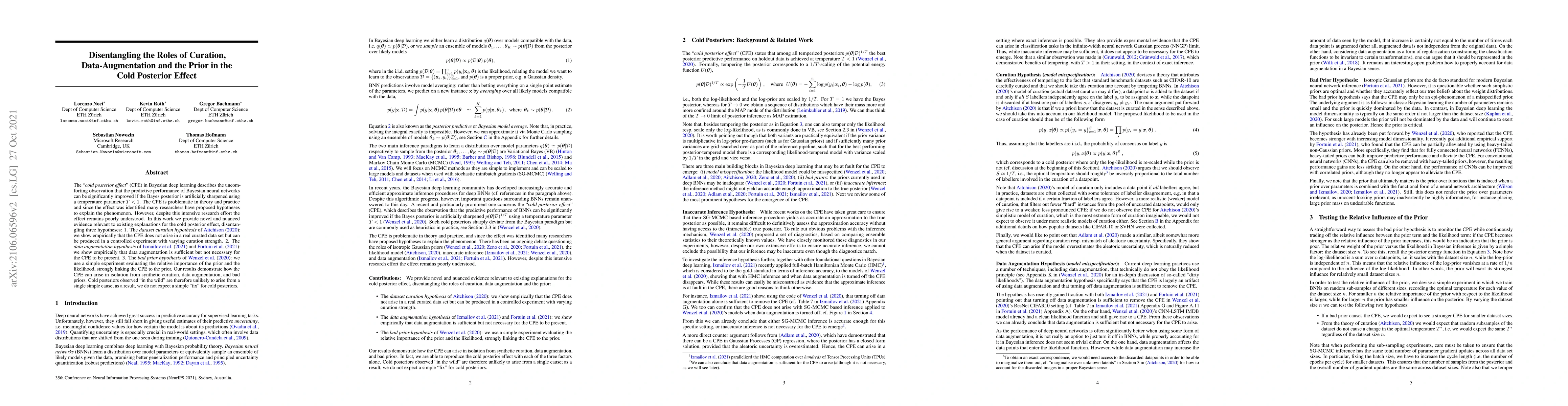 The "cold posterior effect" (CPE) in Bayesian deep learning describes the uncomforting observation that the predictive performance of Bayesian neural networks can be significantly improved if the Bayes posterior is artificially sharpened using a temperature parameter T<1. The CPE is problematic in theory and practice and since the effect was identified many researchers have proposed hypotheses to explain the phenomenon. However, despite this intensive research effort the effect remains poorly understood. In this work we provide novel and nuanced evidence relevant to existing explanations for the cold posterior effect, disentangling three hypotheses: 1. The dataset curation hypothesis of Aitchison (2020): we show empirically that the CPE does not arise in a real curated data set but can be produced in a controlled experiment with varying curation strength. 2. The data augmentation hypothesis of Izmailov et al. (2021) and Fortuin et al. (2021): we show empirically that data augmentation is sufficient but not necessary for the CPE to be present. 3. The bad prior hypothesis of Wenzel et al. (2020): we use a simple experiment evaluating the relative importance of the prior and the likelihood, strongly linking the CPE to the prior. Our results demonstrate how the CPE can arise in isolation from synthetic curation, data augmentation, and bad priors. Cold posteriors observed "in the wild" are therefore unlikely to arise from a single simple cause; as a result, we do not expect a simple "fix" for cold posteriors.