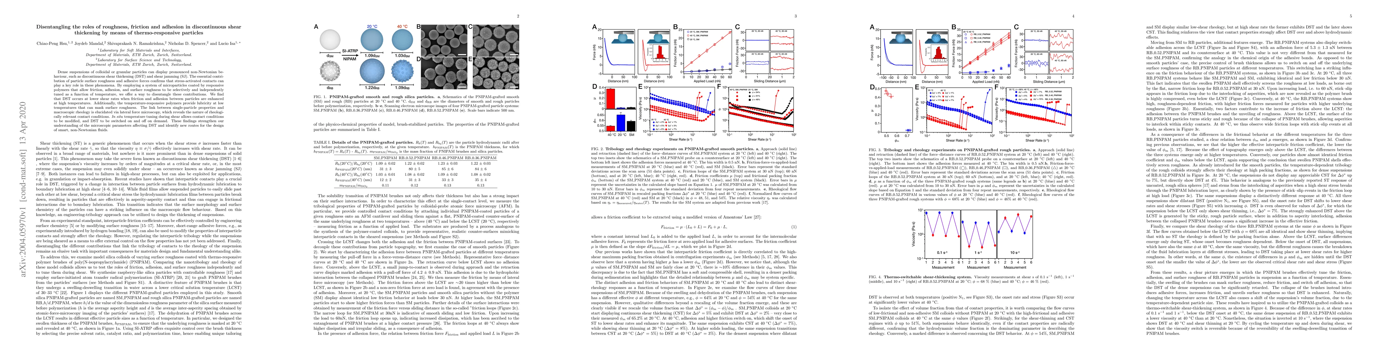 This paper investigates the roles of roughness, friction, and adhesion in discontinuous shear thickening (DST) using thermo-responsive particles. By tuning these properties independently via temperature, the study reveals that DST occurs at lower shear rates with enhanced friction and adhesion at high temperatures, while surface roughness is masked by lubricity at low temperatures.
