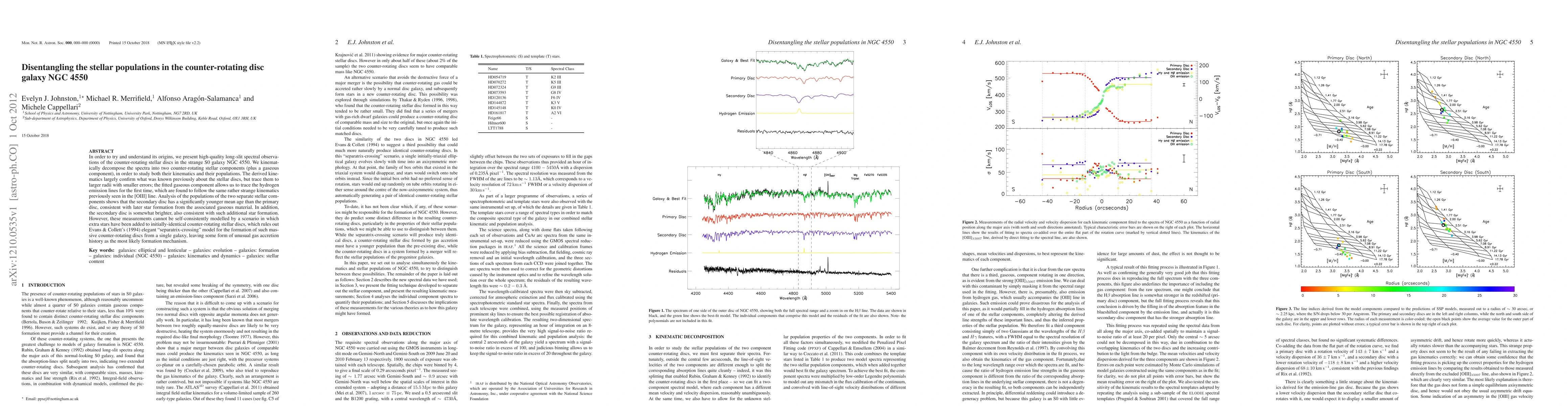 In order to try and understand its origins, we present high-quality long-slit spectral observations of the counter-rotating stellar discs in the strange S0 galaxy NGC 4550. We kinematically decompose the spectra into two counter-rotating stellar components (plus a gaseous component), in order to study both their kinematics and their populations. The derived kinematics largely confirm what was known previously about the stellar discs, but trace them to larger radii with smaller errors; the fitted gaseous component allows us to trace the hydrogen emission lines for the first time, which are found to follow the same rather strange kinematics previously seen in the [OIII] line. Analysis of the populations of the two separate stellar components shows that the secondary disc has a significantly younger mean age than the primary disc, consistent with later star formation from the associated gaseous material. In addition, the secondary disc is somewhat brighter, also consistent with such additional star formation. However, these measurements cannot be self-consistently modelled by a scenario in which extra stars have been added to initially-identical counter-rotating stellar discs, which rules out Evans & Collett's (1994) elegant "separatrix-crossing" model for the formation of such massive counter-rotating discs from a single galaxy, leaving some form of unusual gas accretion history as the most likely formation mechanism.