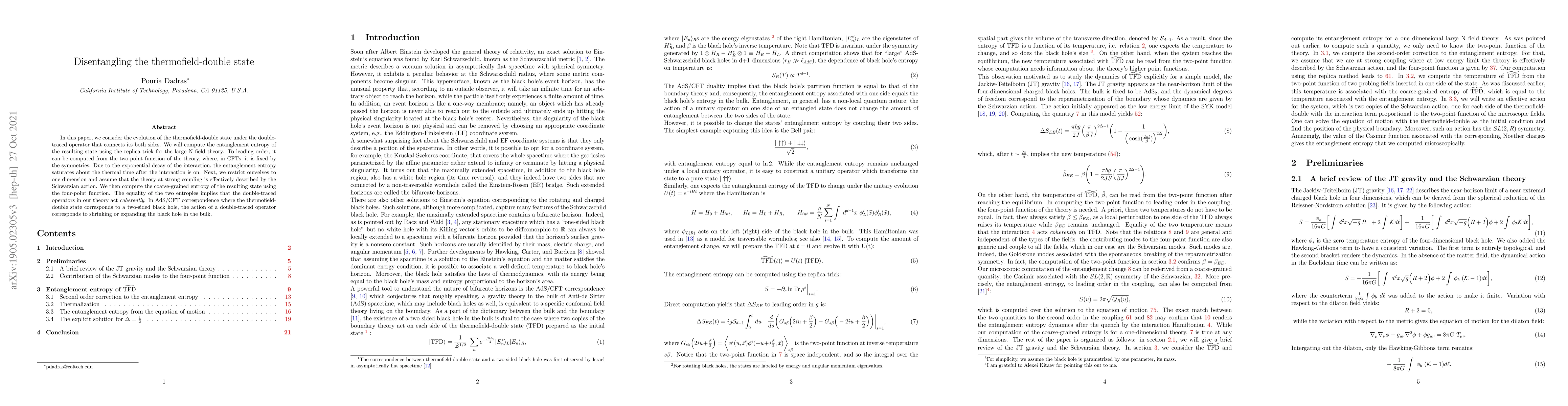 This paper investigates the evolution of the thermofield-double state under a double-traced operator, computing its entanglement entropy using the replica trick in large N field theory. It finds that the entropy saturates after the interaction, and in one dimension, the Schwarzian action describes the strong coupling limit, where the coarse-grained entropy confirms coherent action of double-traced operators, analogous to black hole dynamics in AdS/CFT.