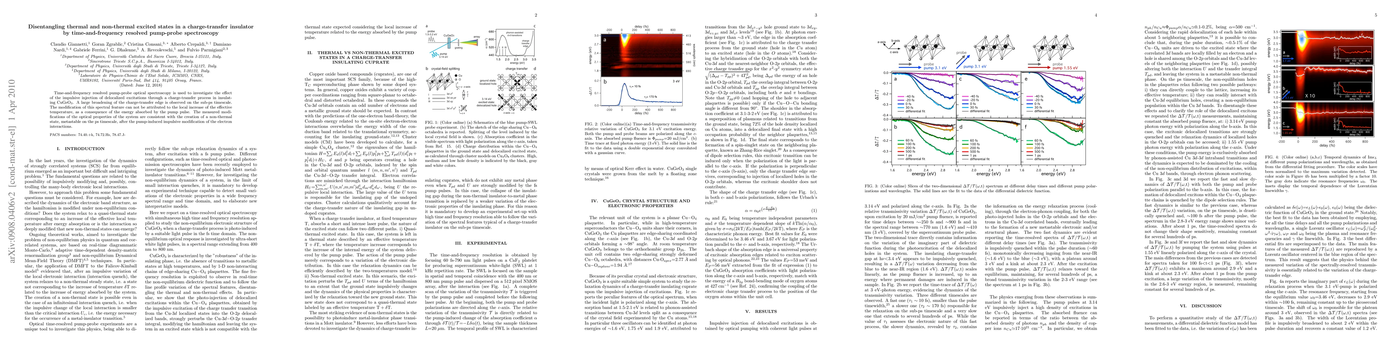 This study employs time-and-frequency resolved pump-probe spectroscopy to investigate the charge-transfer process in insulating CuGeO3. The results reveal a non-thermal excited state, metastable on the sub-ps timescale, rather than a thermal state induced by the pump pulse.