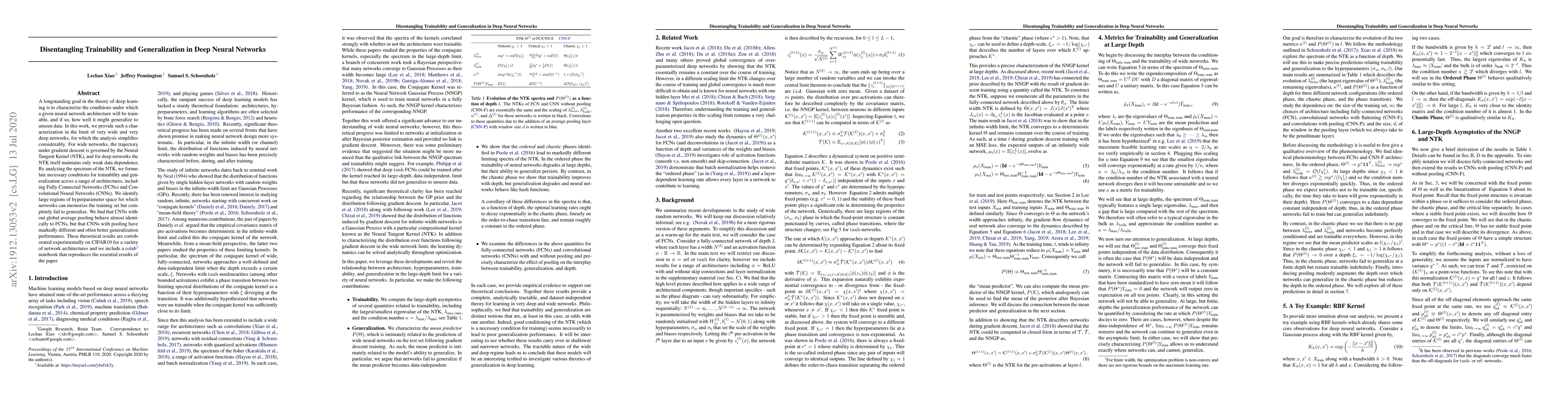 This paper characterizes trainability and generalization in deep neural networks by analyzing the Neural Tangent Kernel (NTK) in wide and deep networks. It identifies conditions for effective generalization and finds that CNNs with pooling outperform those without pooling, corroborated experimentally on CIFAR10.