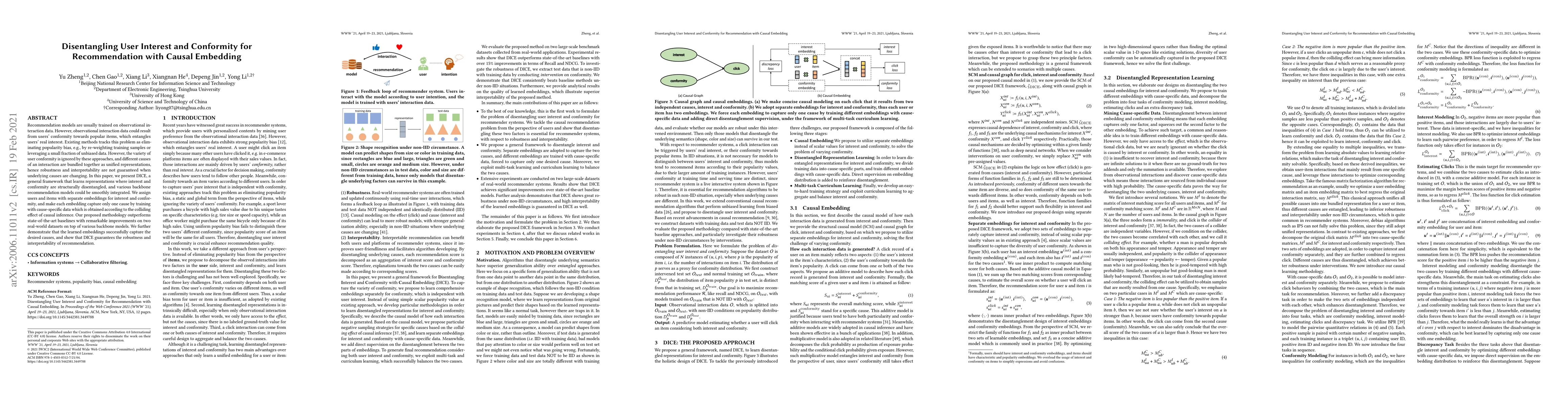 Recommendation models are usually trained on observational interaction data. However, observational interaction data could result from users' conformity towards popular items, which entangles users' real interest. Existing methods tracks this problem as eliminating popularity bias, e.g., by re-weighting training samples or leveraging a small fraction of unbiased data. However, the variety of user conformity is ignored by these approaches, and different causes of an interaction are bundled together as unified representations, hence robustness and interpretability are not guaranteed when underlying causes are changing. In this paper, we present DICE, a general framework that learns representations where interest and conformity are structurally disentangled, and various backbone recommendation models could be smoothly integrated. We assign users and items with separate embeddings for interest and conformity, and make each embedding capture only one cause by training with cause-specific data which is obtained according to the colliding effect of causal inference. Our proposed methodology outperforms state-of-the-art baselines with remarkable improvements on two real-world datasets on top of various backbone models. We further demonstrate that the learned embeddings successfully capture the desired causes, and show that DICE guarantees the robustness and interpretability of recommendation.