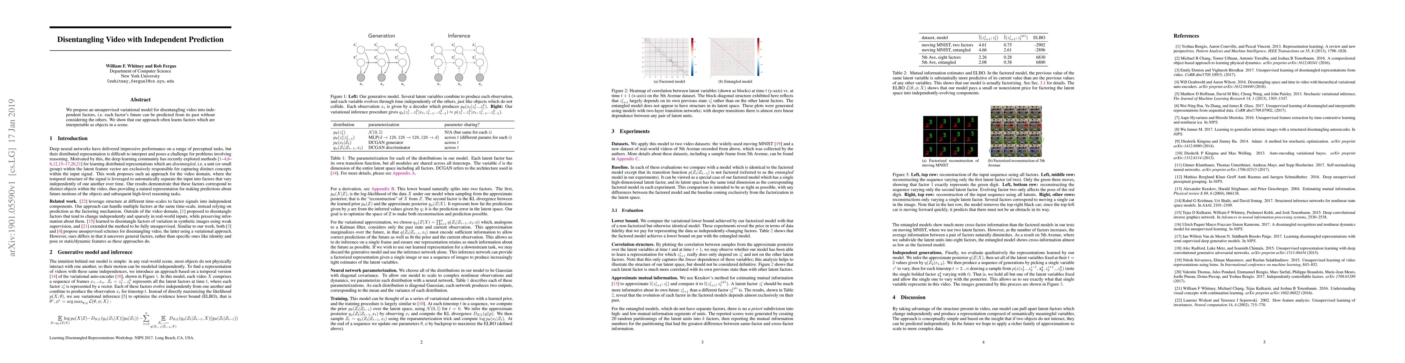 We propose an unsupervised variational model for disentangling video into independent factors, i.e. each factor's future can be predicted from its past without considering the others. We show that our approach often learns factors which are interpretable as objects in a scene.