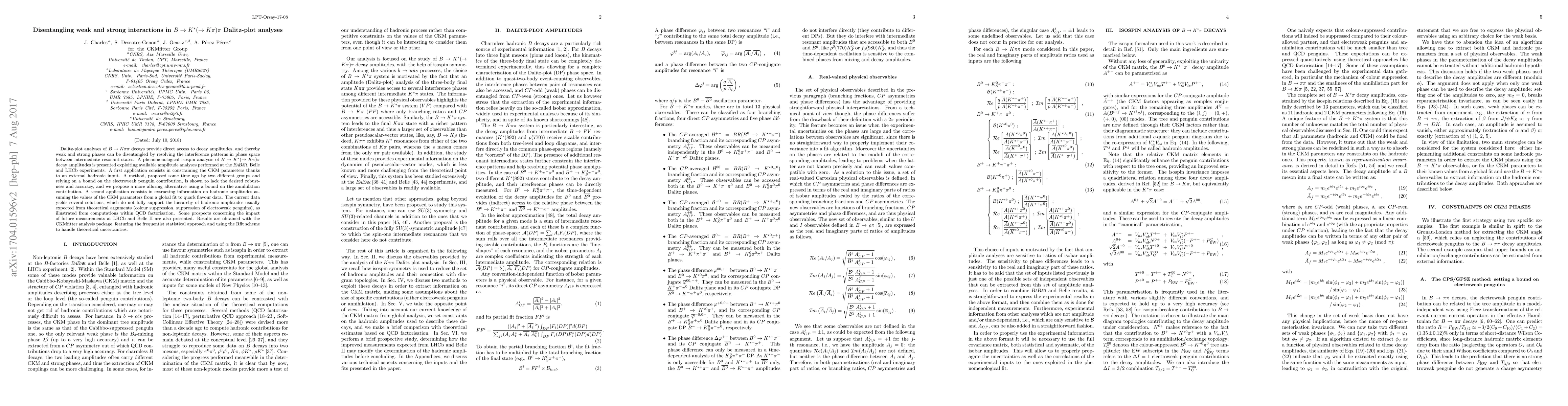 Dalitz-plot analyses of $B\rightarrow K\pi\pi$ decays provide direct access to decay amplitudes, and thereby weak and strong phases can be disentangled by resolving the interference patterns in phase space between intermediate resonant states. A phenomenological isospin analysis of $B\rightarrow K^*(\rightarrow K\pi)\pi$ decay amplitudes is presented exploiting available amplitude analyses performed at the Babar, Belle and LHCb experiments. A first application consists in constraining the CKM parameters thanks to an external hadronic input. A method, proposed some time ago by two different groups and relying on a bound on the electroweak penguin contribution, is shown to lack the desired robustness and accuracy, and we propose a more alluring alternative using a bound on the annihilation contribution. A second application consists in extracting information on hadronic amplitudes assuming the values of the CKM parameters from a global fit to quark flavour data. The current data yields several solutions, which do not fully support the hierarchy of hadronic amplitudes usually expected from theoretical arguments (colour suppression, suppression of electroweak penguins), as illustrated from computations within QCD factorisation. Some prospects concerning the impact of future measurements at LHCb and Belle II are also presented. Results are obtained with the CKMfitter analysis package, featuring the frequentist statistical approach and using the Rfit scheme to handle theoretical uncertainties.